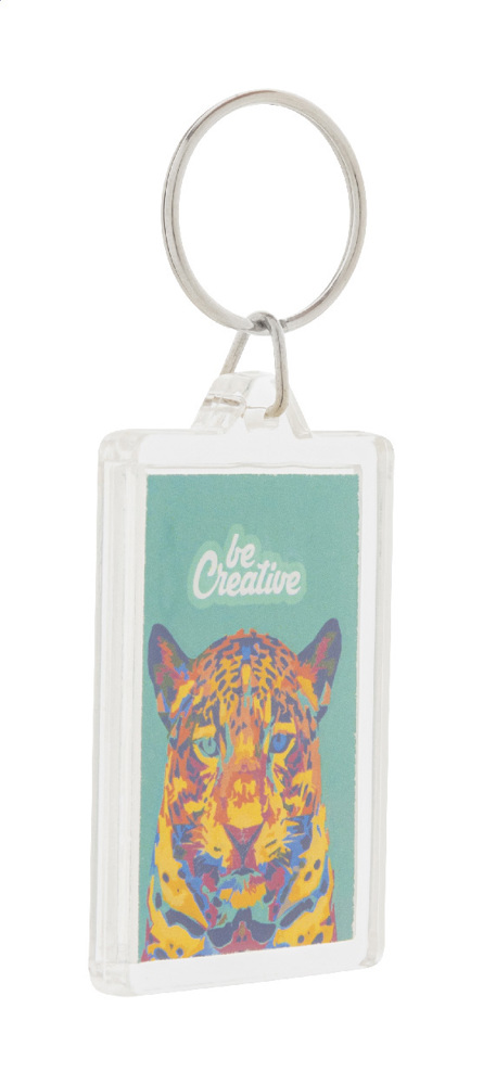 Rechthoekvormige acryl sleutelhanger met op maat gemaakt full colour papieren inzetstuk en metalen ring. Prijs is inclusief digitaal printen aan beide zijden. MOQ: 100 stuks.