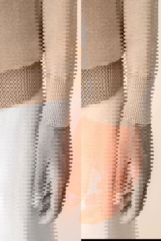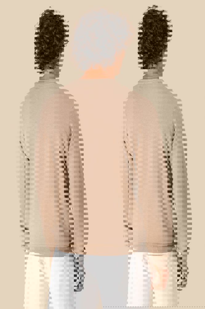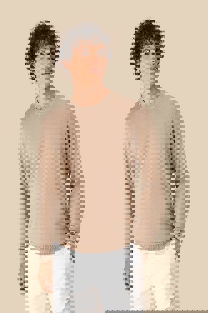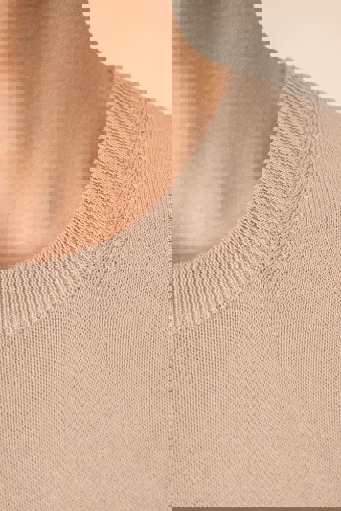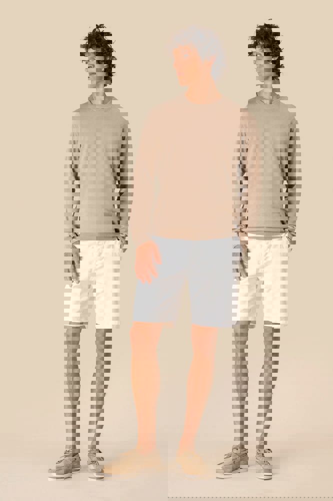 100% biologisch katoen. Gekamd katoen. Gauge 12. Rechte snit. 1x1 ribboord aan kraag, zoom en mouwuiteinden. 'Fully Fashion' gebreid. Behandeld tegen pluizen. De hals is aan de binnenkant afgewerkt met ton-sur-ton nektape in de hoofdstof. Gemiddeld gewicht in maat L: 270 g.
