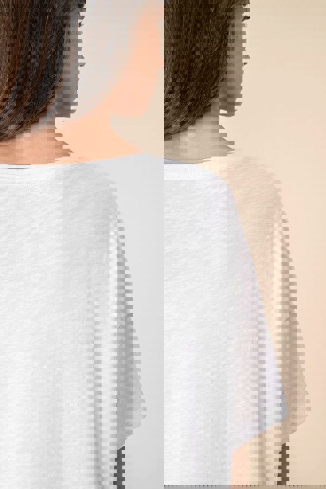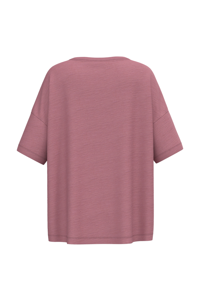 100% biologisch katoen. Gekamd katoen. Jerseytricot met gevlamd effect. Oversized pasvorm met afhangende schouders. Enzymgewassen. Zijnaden. Ronde hals met 1x1 ribboord. Schouderversteviging. De hals is aan de binnenkant afgewerkt met ton-sur-ton nektape in de hoofdstof. Afgewerkt met dubbel stiksel aan mouwuiteinden en onderkant.