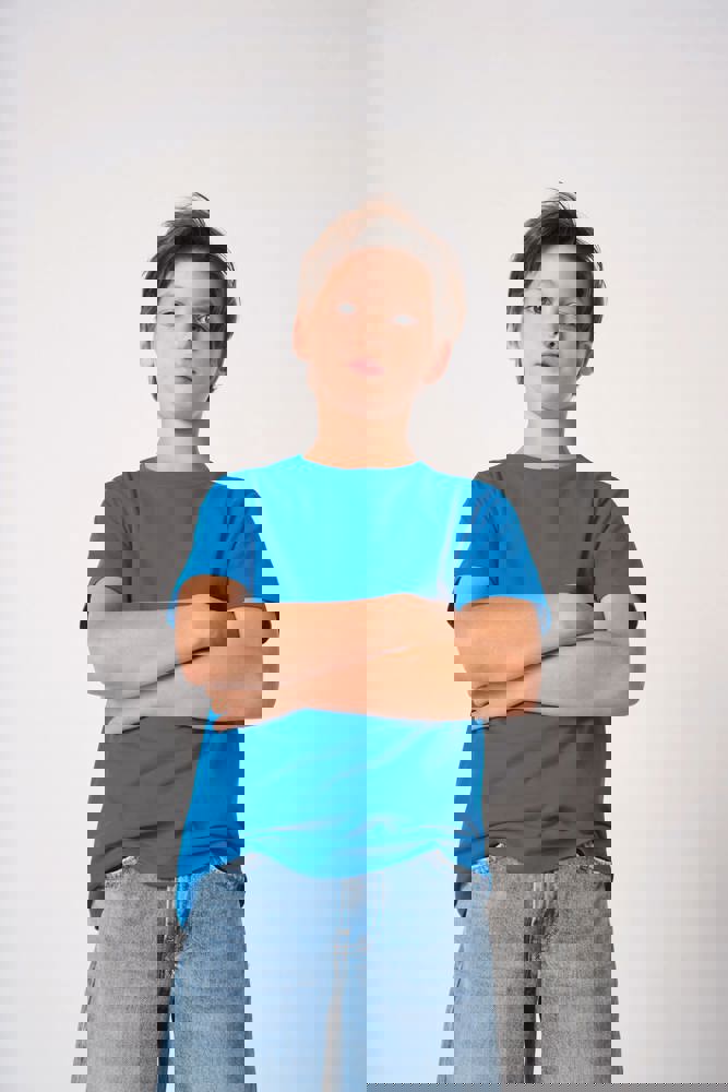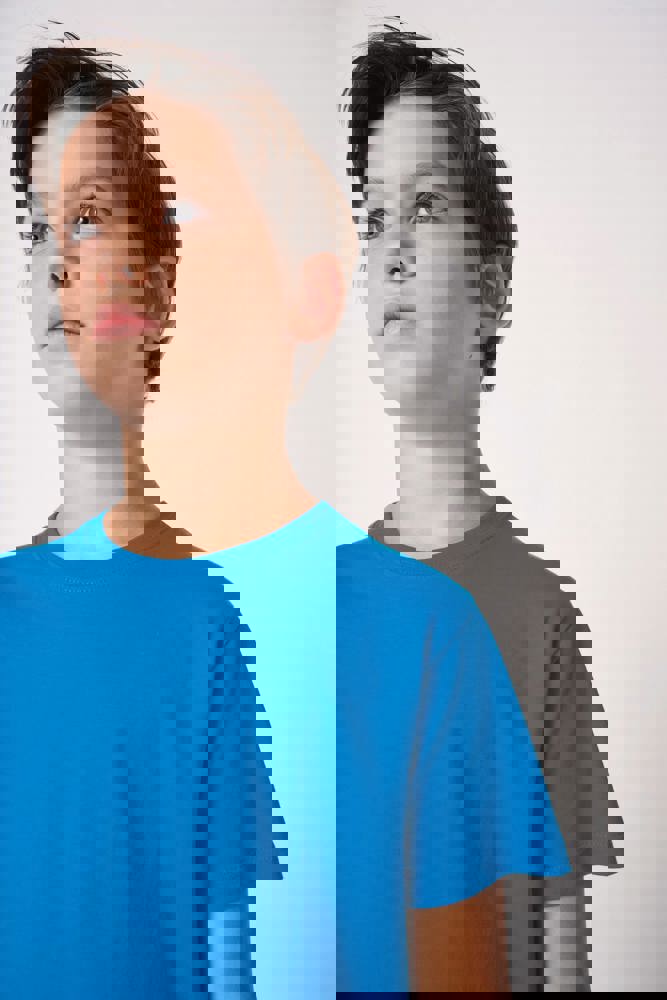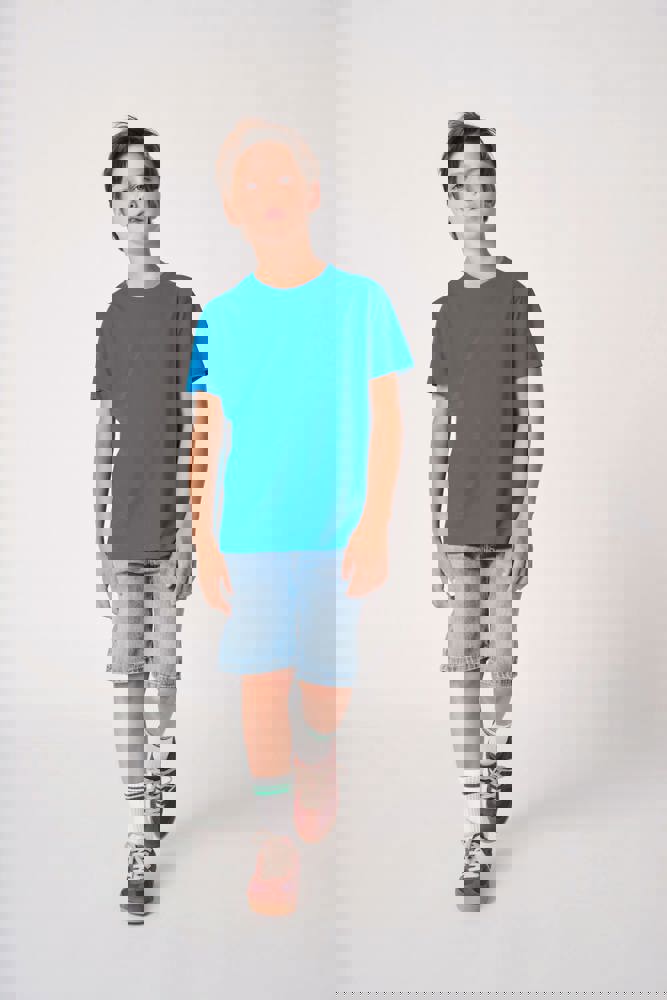 Effen kleuren: 100% katoen. Kleur Ideal Ash Heather: 99% katoen / 1% viscose. Kleur Ideal Oxford Grey: 90% katoen / 10% viscose. Cut & sewn jersey van maat 1/2 t/m 6/8 en tubulair van maat 8/10 t/m 12/14. Rechte snit. Ronde hals in 1x1 ribboordafwerking met dubbele stiksels. Toon-op-toon nektape aan de binnenzijde. Mouwboorden en zoom afgewerkt met dubbele stiksels. Afneembaar merklabel.