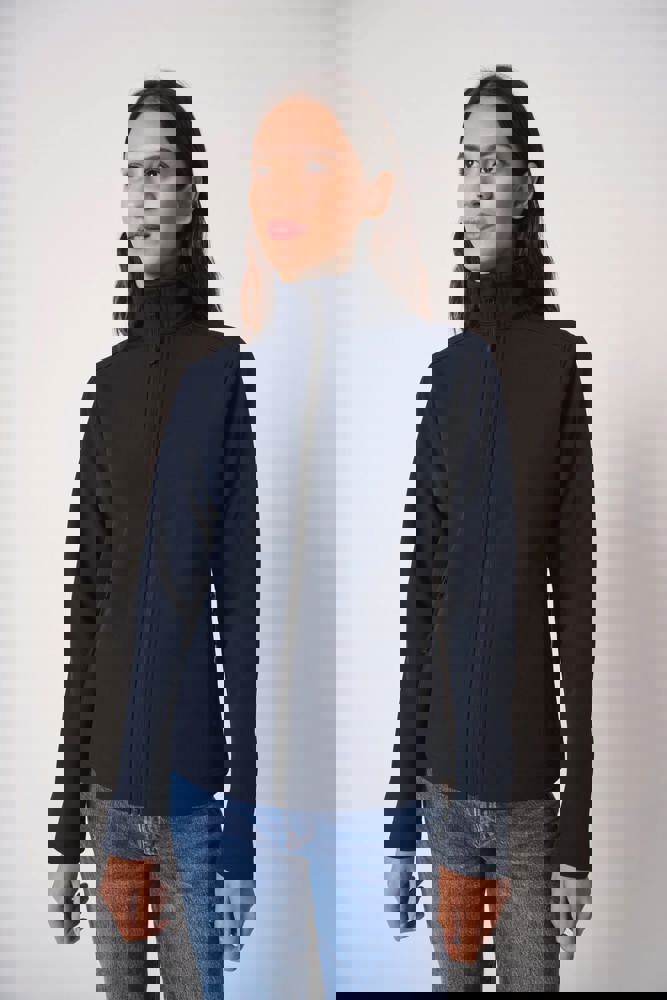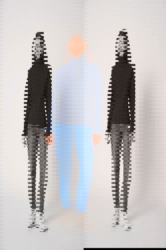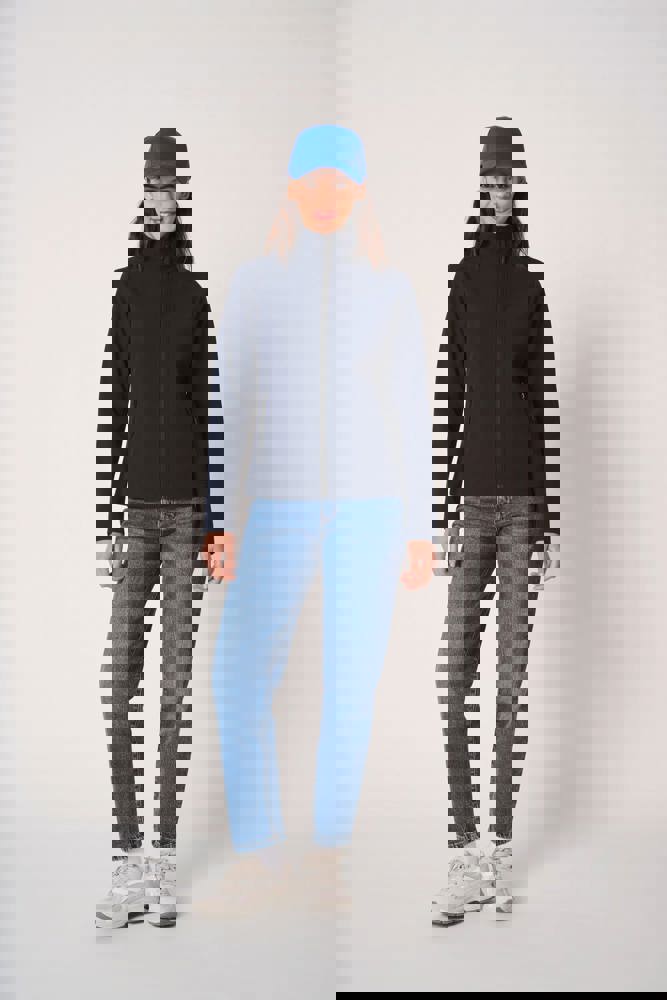 95% polyester / 5% elastaan. Softshell 2 lagen met waterafstotende behandeling. Binnenkant: zwarte micropolar van 100% polyester. Rechte snit. Twee zijzakken met polytricot voering, nylonritsen en zwarte ritstrekkers. Ritssluiting in zwart nylon met kinbescherming en ritstrekker. Schouder- en rugstukken met sierstiksels. Zwarte nektape aan de binnenzijde. Mouwboorden en zoom afgewerkt met dubbele stiksels. Afneembaar merklabel.