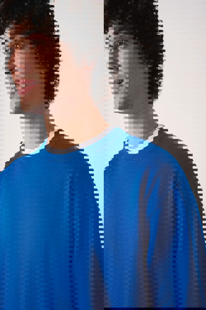 50% katoen / 50% polyester. Geruwd molton, tubulair geweven. Rechte snit. Hals, mouwboorden en zoom in 1x1 ribboord met dubbele stiksels. Afneembaar merklabel.