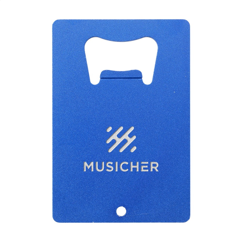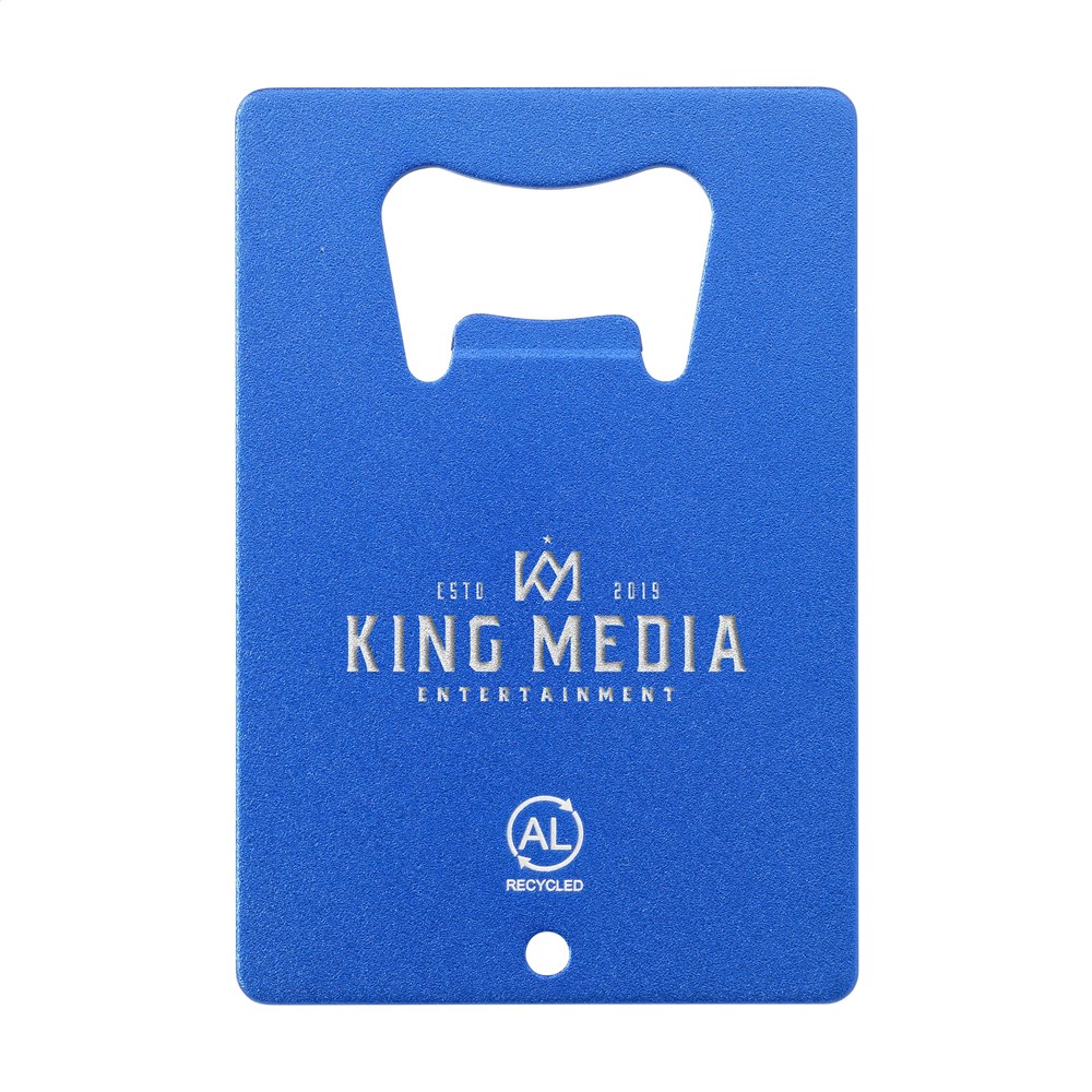 Flesopener van 100% gerecycled aluminium. De opener heeft het prettige formaat van een creditcard en is gemakkelijk aan een sleutelring te bevestigen. GRS-gecertificeerd. Aluminium kan oneindig vaak gerecycled worden terwijl de kwaliteit van het materiaal behouden blijft. Door het gebruik van gerecycled aluminium worden er minder nieuwe grondstoffen gebruikt tijdens de productie van dit product. Dit betekent minder energieverbruik en minder gebruik van water.