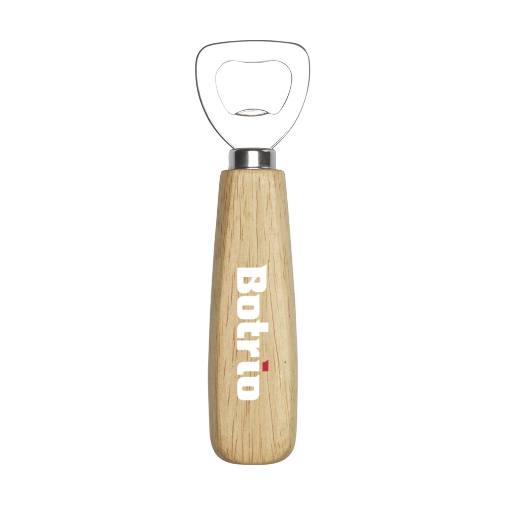 Flesopener met een handgreep van beukenhout. Ligt prettig in de hand.