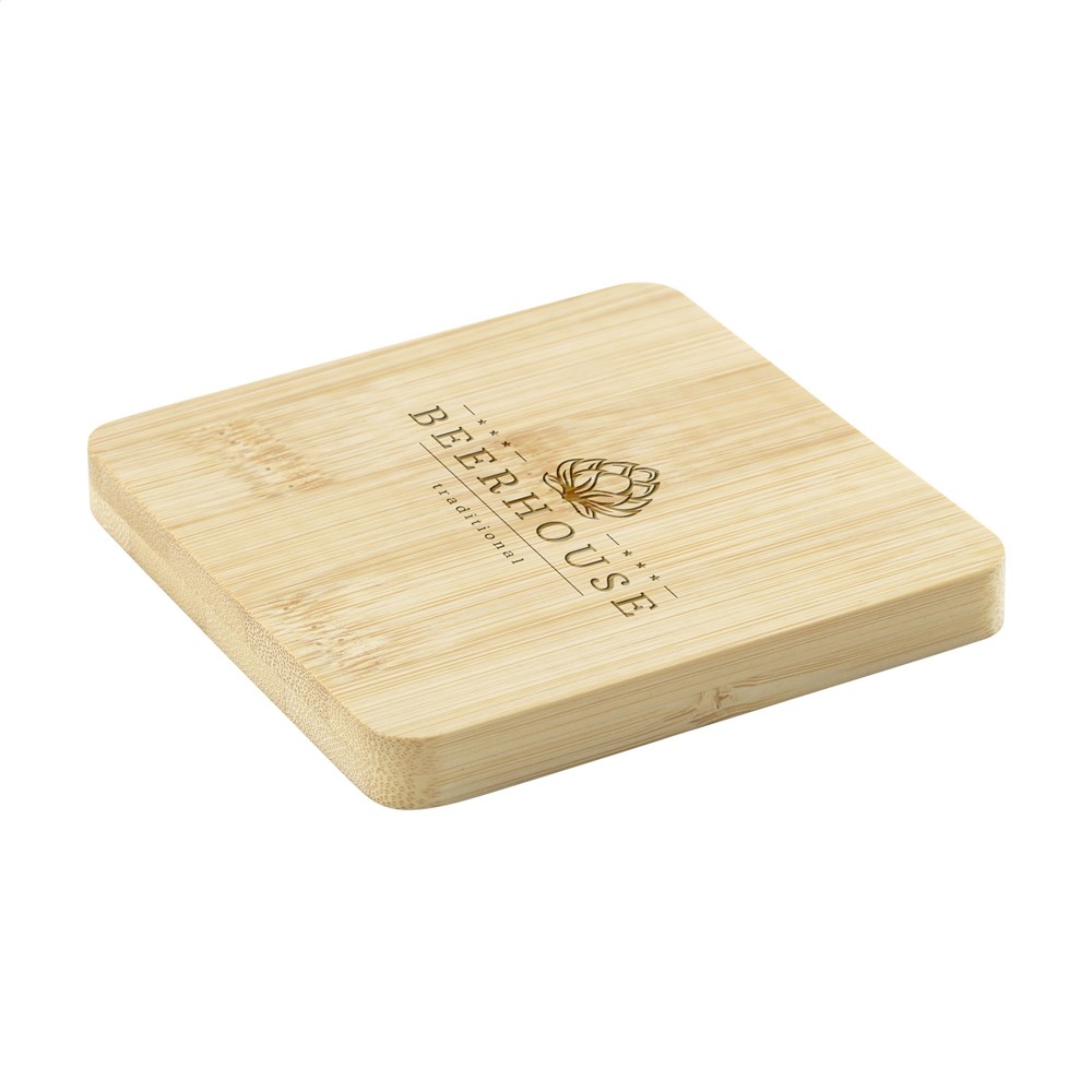 Vierkante onderzetter van bamboe met metalen flesopener in de onderzijde. Praktisch en multifunctioneel. Bamboe is een natuurlijk materiaal. Hierdoor kan de kleur per product variëren.