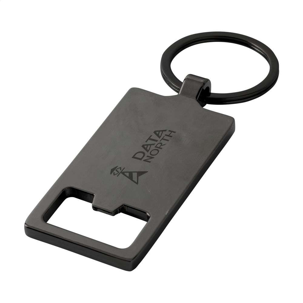 Sleutelhanger met flesopener. Met een hardhouten handgreep en een opener van zinklegering. Bevestigd aan een stevige, metalen sleutelring. Per stuk verpakt.