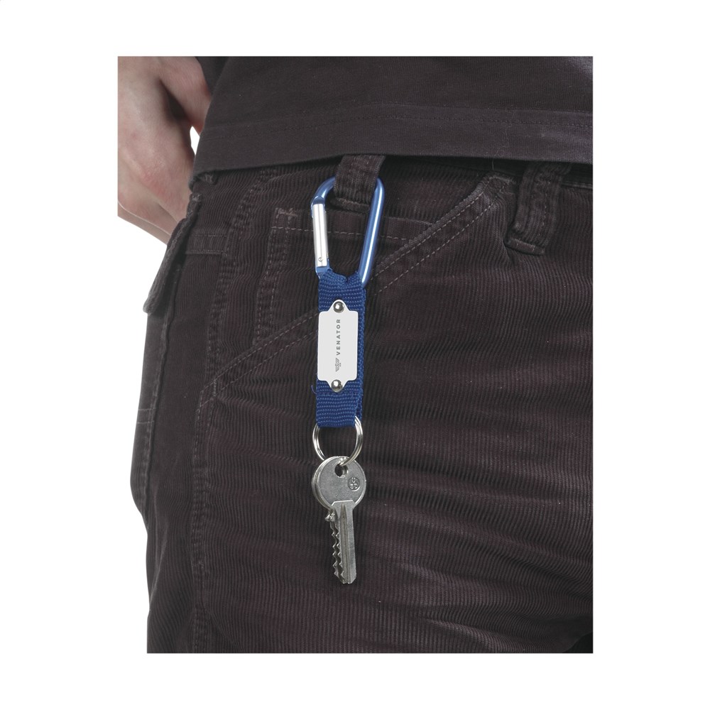 Karabijnhaak gecombineerd met sterk geweven nylon aan stevige sleutelring.