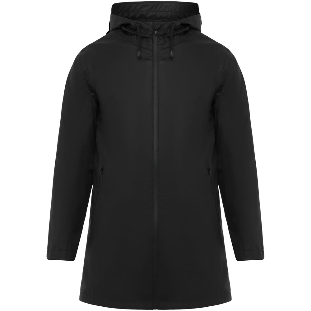 Waterdichte regenjas. Capuchon met klep. Door hitte gesealde ritsen en naden. Contrasterende details in zwart. Twee zijzakken met rits. Split aan de achterkant. Verwijderbaar etiket. Waterbestendig. Het model is 185 cm en draagt maat M.