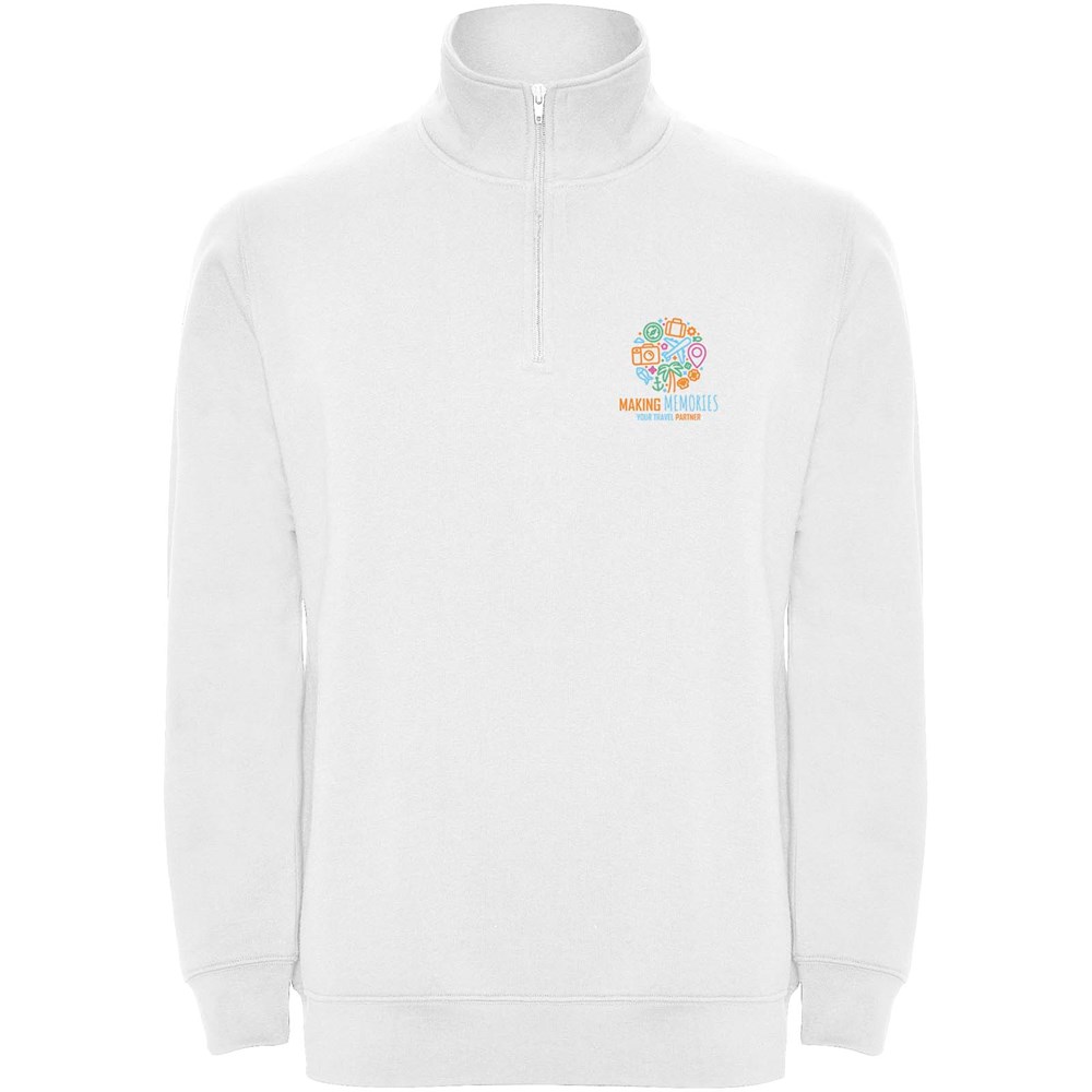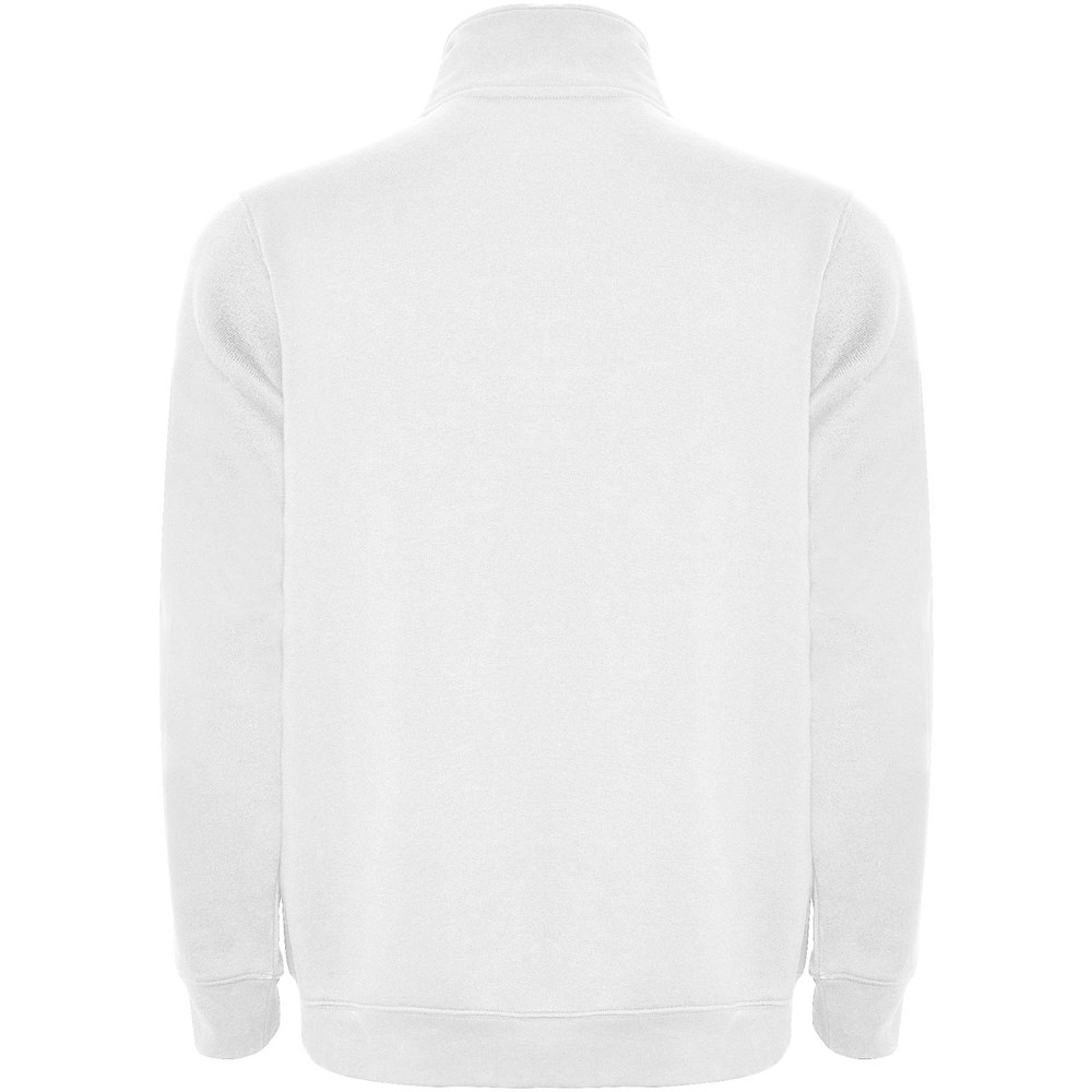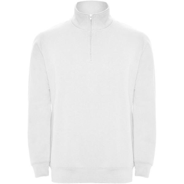 Sweatshirt met halve rits in dezelfde kleur en staande kraag. Binnenkant van de kraag in dezelfde kleur. Versterkte naadafdekkingen aan de binnenzijde van de kraag. Manchetten en tailleband in ribboord 1x1. Het model is 185 cm en draagt maat M.