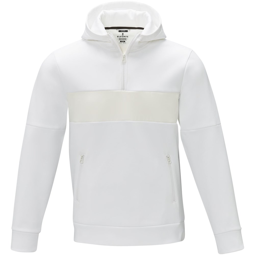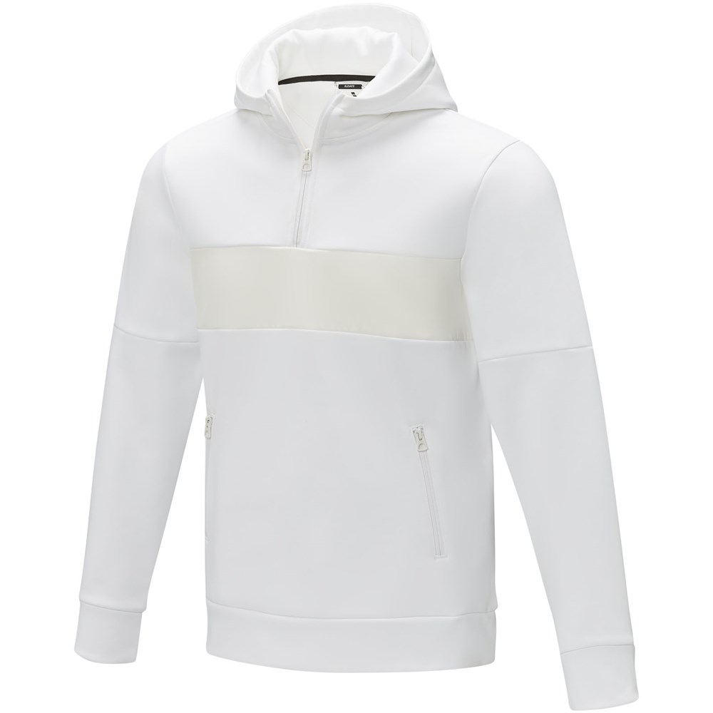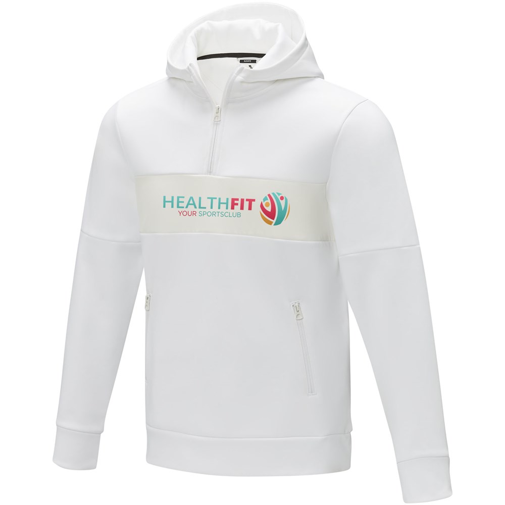 De Sayan heren sweater met capuchon en halve rits - een unieke combinatie van prestaties en stijl. Het anorak ontwerp combineert mode en functie naadloos, met een kwart rits voor veelzijdigheid in laagjes. Gemaakt van een 350 g/m² mix van polyester en Sorona® breisel. De Sorona® vezel verhoogt de milieuvriendelijkheid van de sweater door een duurzaam element toe te voegen zonder afbreuk te doen aan de prestaties. De contraststof op het voorpand, gemaakt van 280T ripstop nylon, voegt duurzaamheid en textuur toe aan het ontwerp en is de ideale plek om je merk onder de aandacht te brengen. Of je nu aan een outdooravontuur begint of gewoon je dagelijkse routine volgt, de Sayan sweater met capuchon combineert moeiteloos mode met functie.