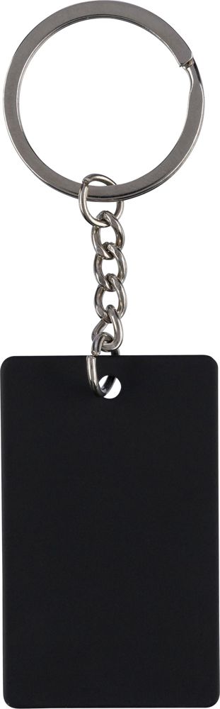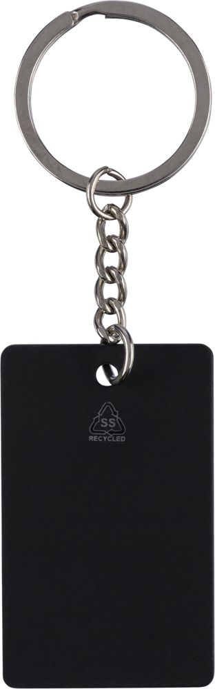 Gerecycleerde roestvrijstalen rubberen sleutelhanger met metalen ring in een rechthoekige vorm. Voorzien van een gegraveerd gerecycled logo dat na gravering een glanzend spiegeleffect onthult. Per stuk verpakt in een kraftpapieren envelop.