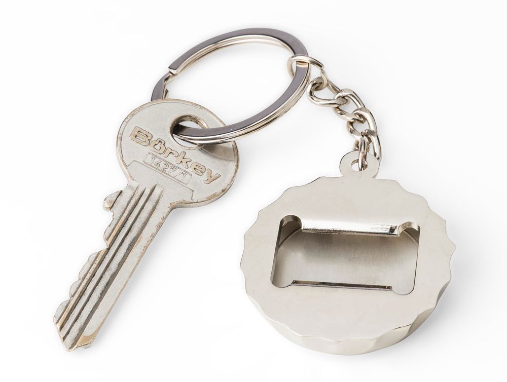 Sleutelhanger van zinklegering met bamboe-inleg aan de voorkant en geïntegreerde flesopener aan de achterkant. Voorzien van een metalen sleutelring en verpakt in een papieren zakje.