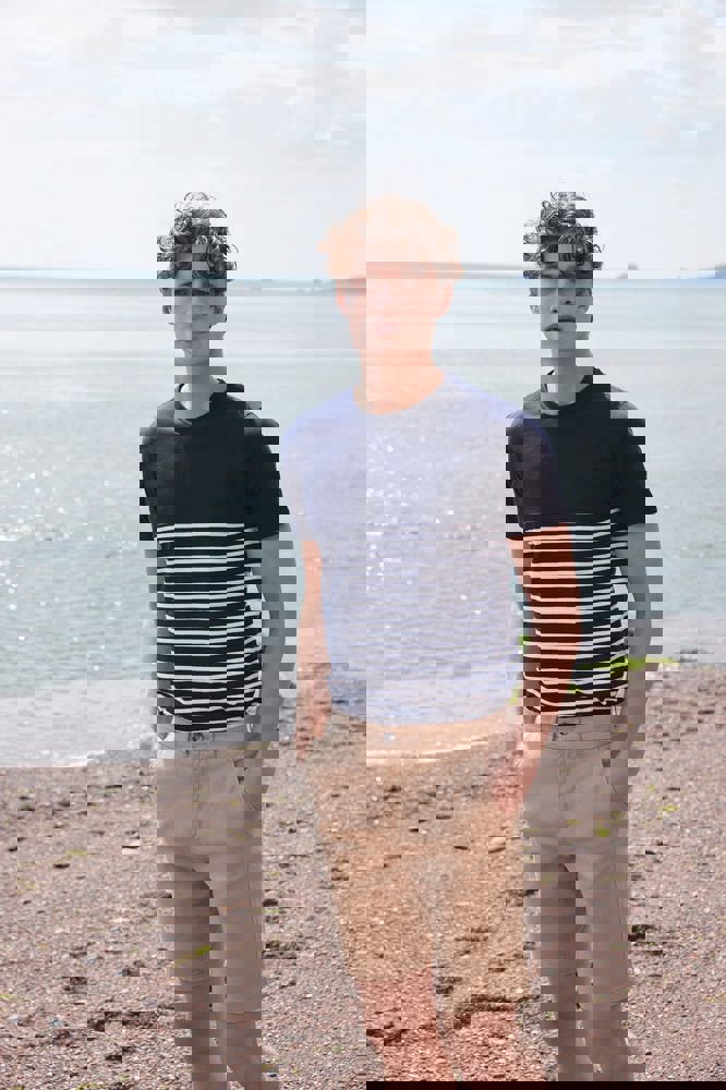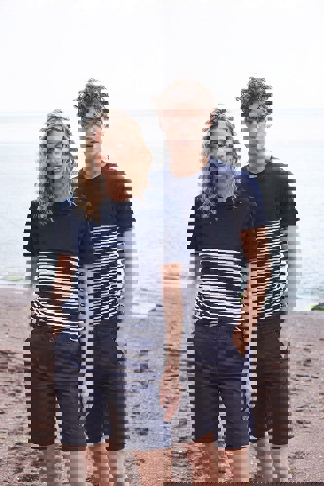 100% katoen jersey. Dikker t-shirt met korte mouwen. Klassieke snit. No label. Ronde hals met stretch geribde hals. Dubbelgestikt bij manchetten en zoom. V-flatlockstiksels aan de hals. Met flatlocknaden bij hals, schoudernaden en armgaten. Hoge naad op de borstzoom. Onderaan gestreept. Contrasterende effen bovenkant en mouwen.