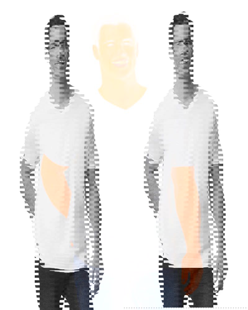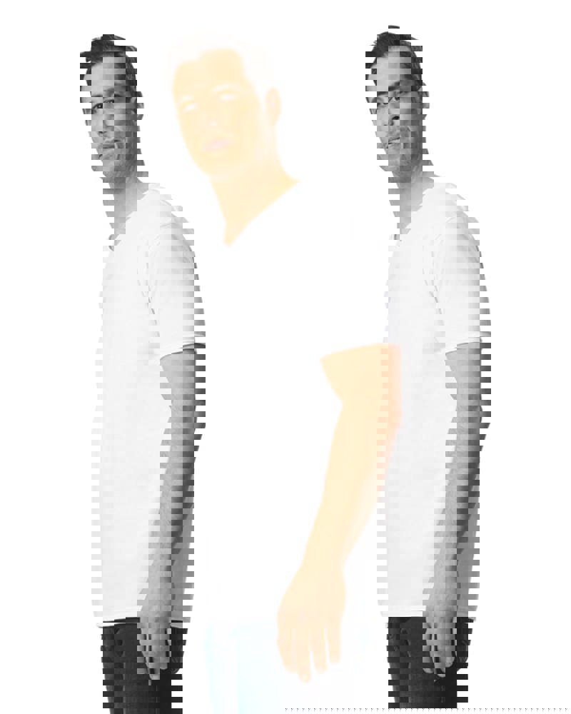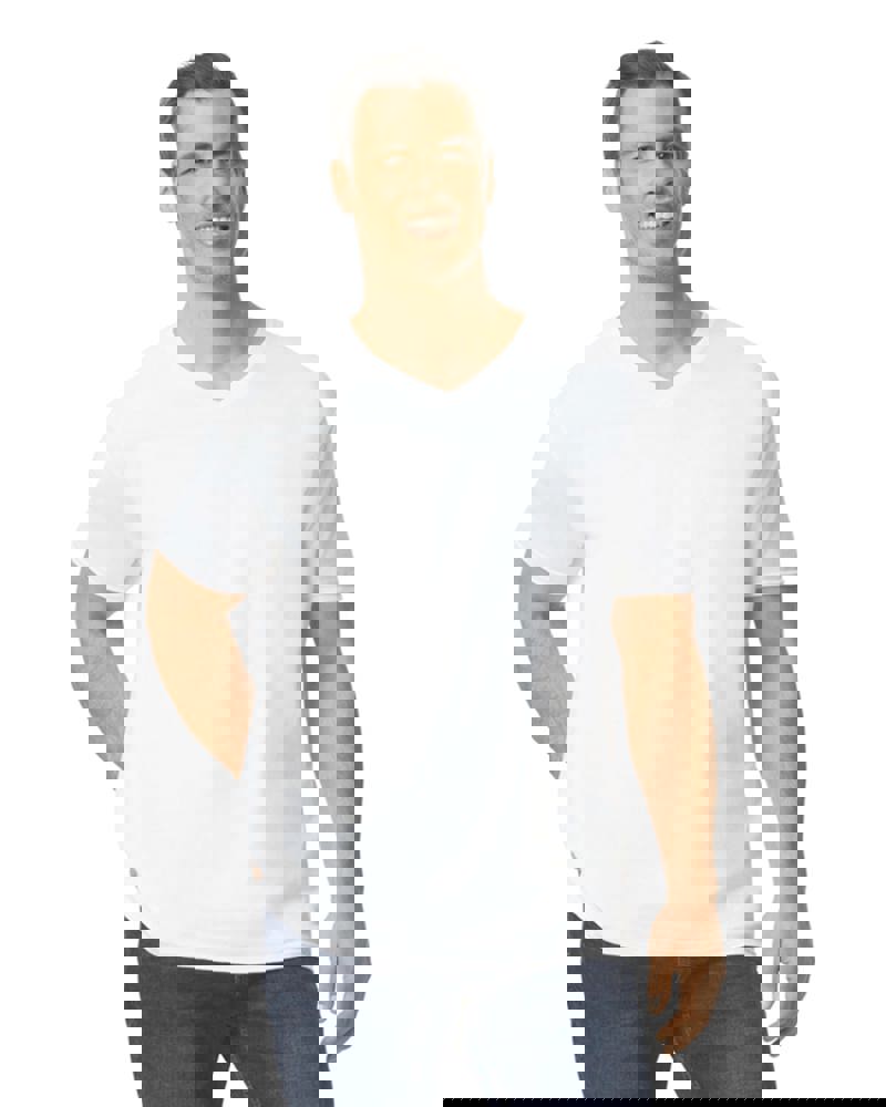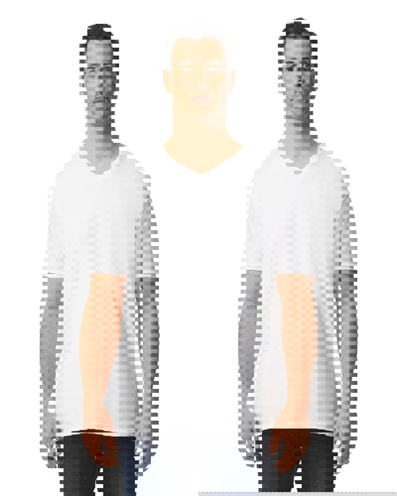 100% voorgekrompen ringgesponnen katoen (Sport grey: 90% katoen / 10% polyester). Jersey steek. Kraag in rib. Nektape van schouder tot schouder. Diepe V-hals. Europese maatvoering. Afgewerkt met dubbele stiksels. De stof is een kwartslag gedraaid om de middenvouw weg te werken.