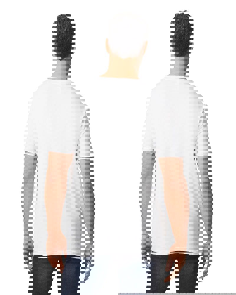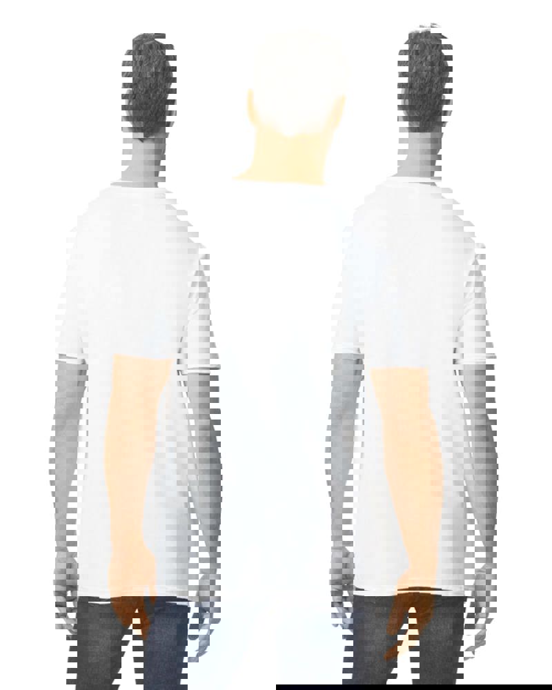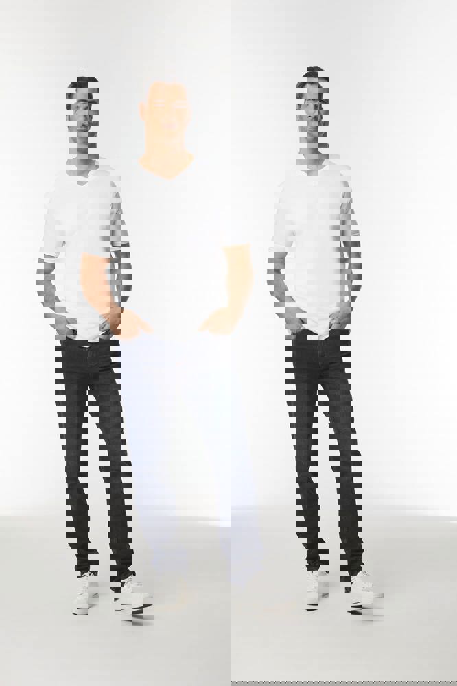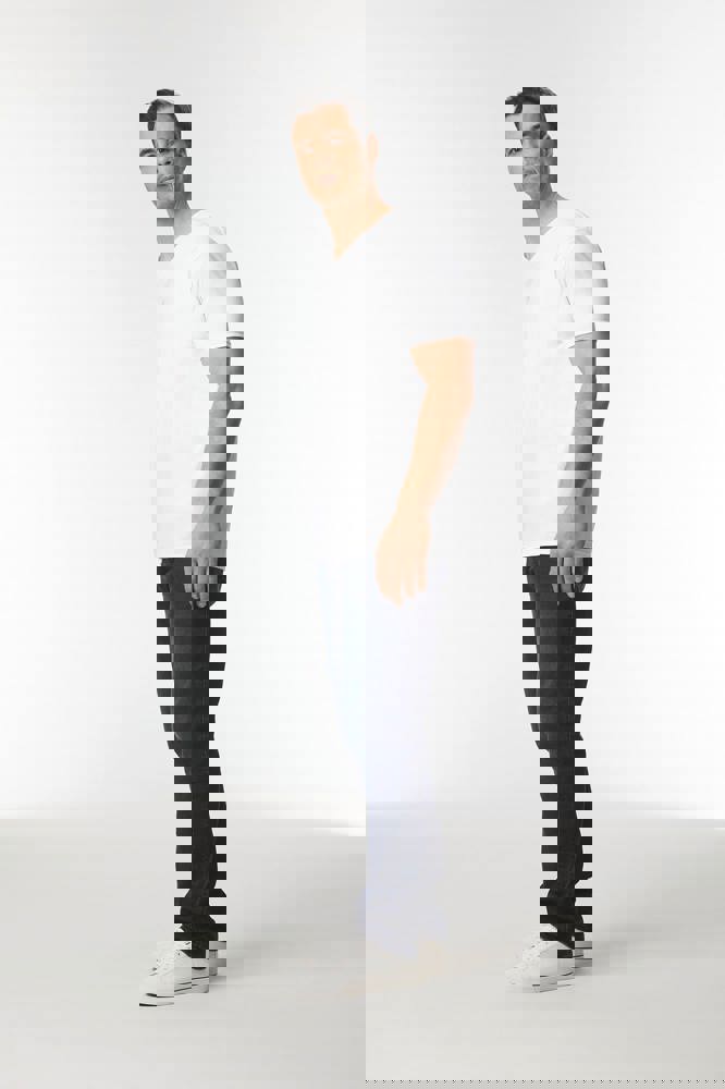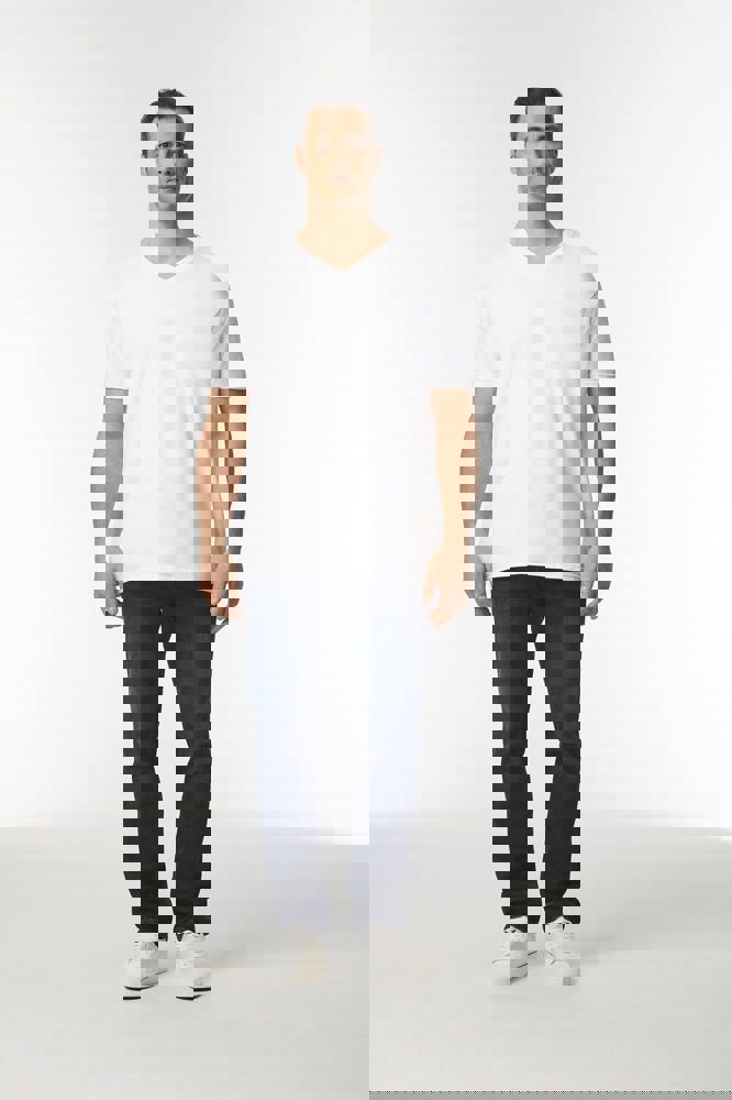 100% voorgekrompen ringgesponnen katoen (Sport grey: 90% katoen / 10% polyester). Jersey steek. Kraag in rib. Nektape van schouder tot schouder. Diepe V-hals. Europese maatvoering. Afgewerkt met dubbele stiksels. De stof is een kwartslag gedraaid om de middenvouw weg te werken.