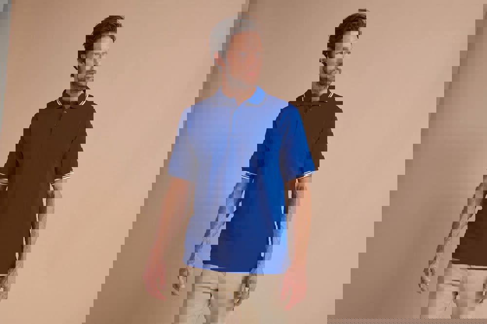 100% Coolplus® polyester. Micro piqué. Knooplijst met twee ton-sur-ton knopen. Kraag en mouwuiteinde in rib en contrastkleur. Zijsplitten.