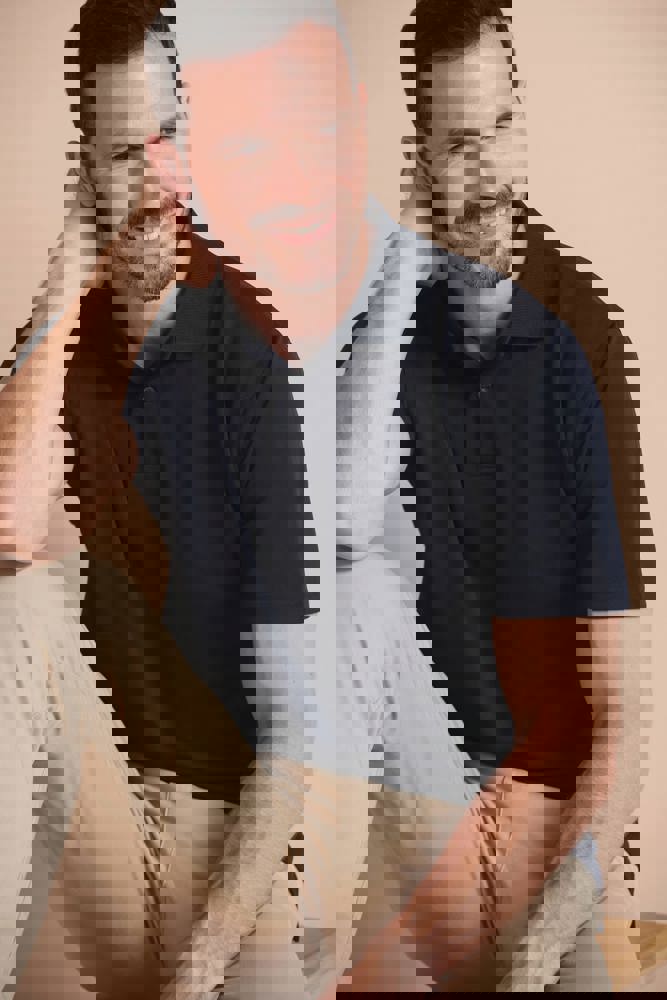 100% Coolplus® polyester. Micropiqué. Klassieke snit. Knooplijst met 2 ton-sur-ton knopen. Platte gebreide kraag. Zijsplitten.