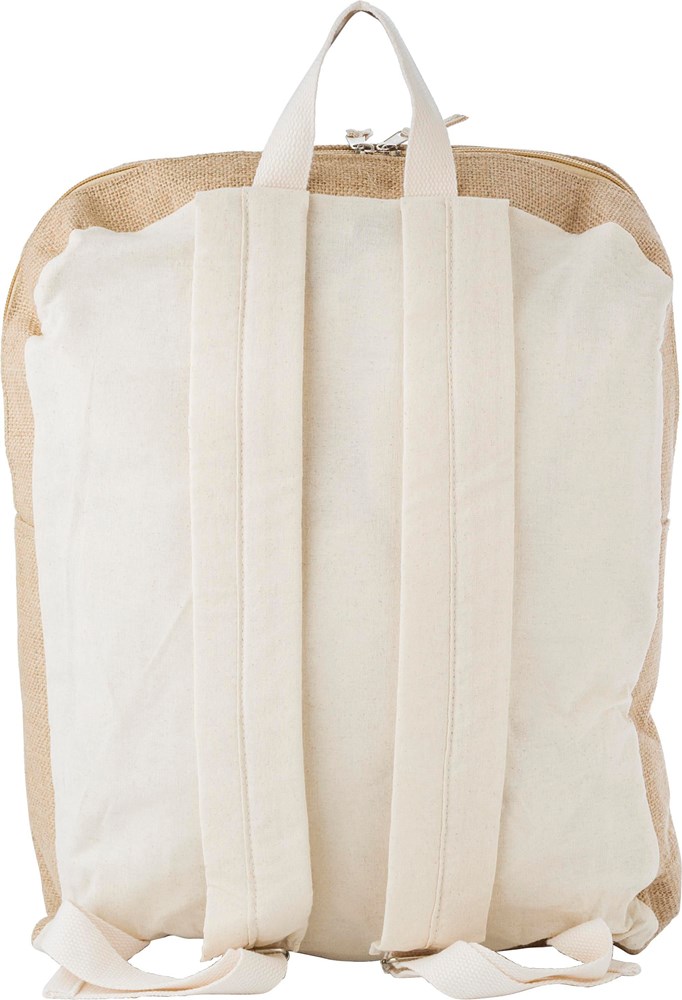 Jute rugzak met katoenen details. Met hoofdvak met ritssluiting en voorvak. Verstelbare bandjes.