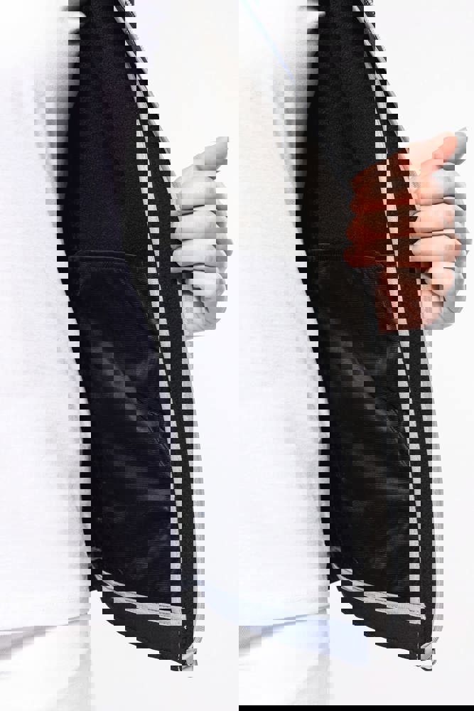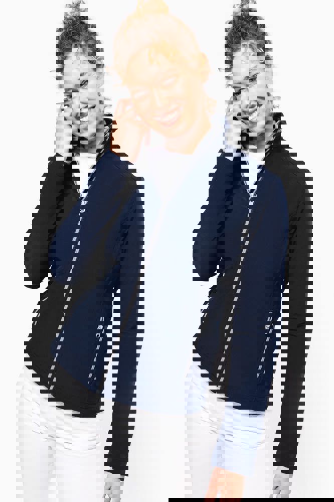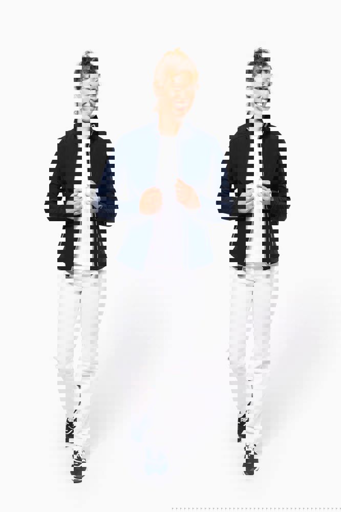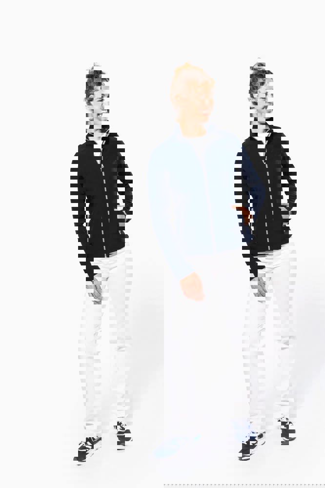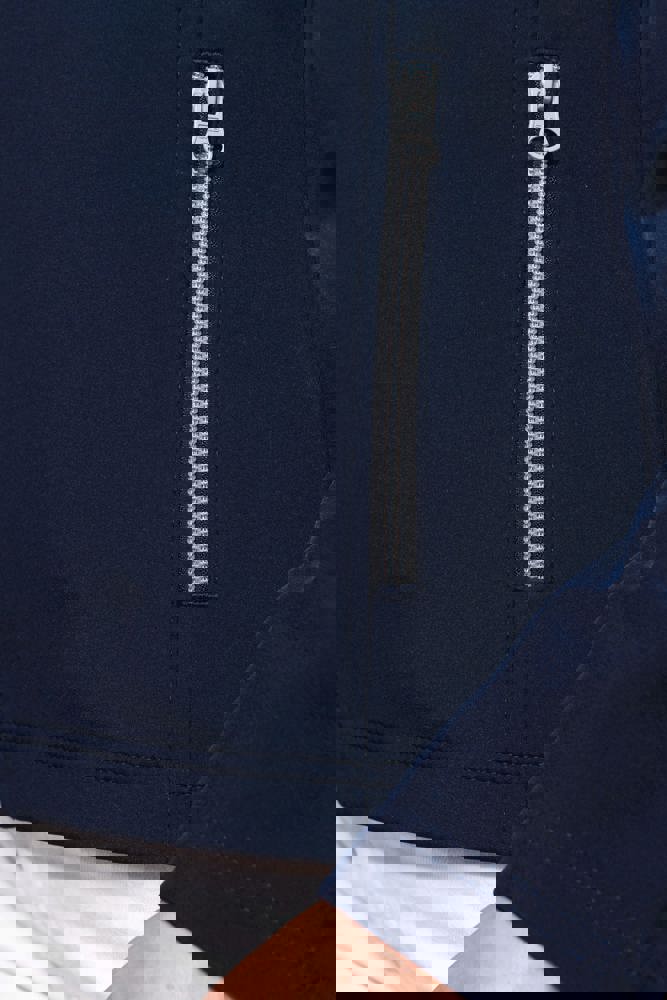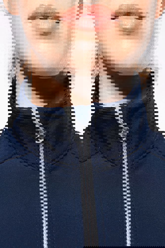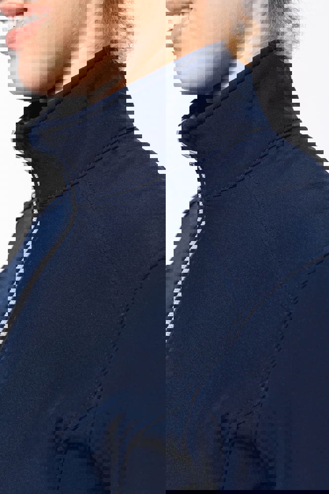 Buitenkant: 95% polyester / 5% elasthan. Binnenkant: 100% microfleece polyester. Waterafstotende stof. Getailleerde snit. 2 ritszakken aan de buitenkant. Contrasterende ritssluitingen. Verlengd achterpand. Stiksels op schouders en aan de zijkant.