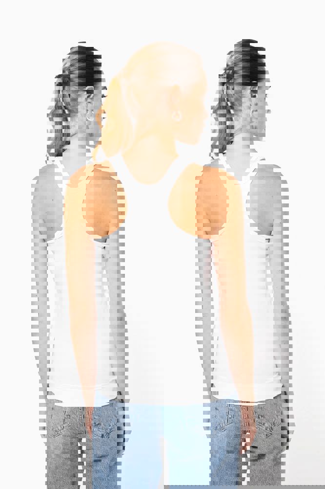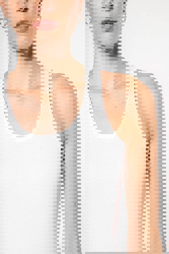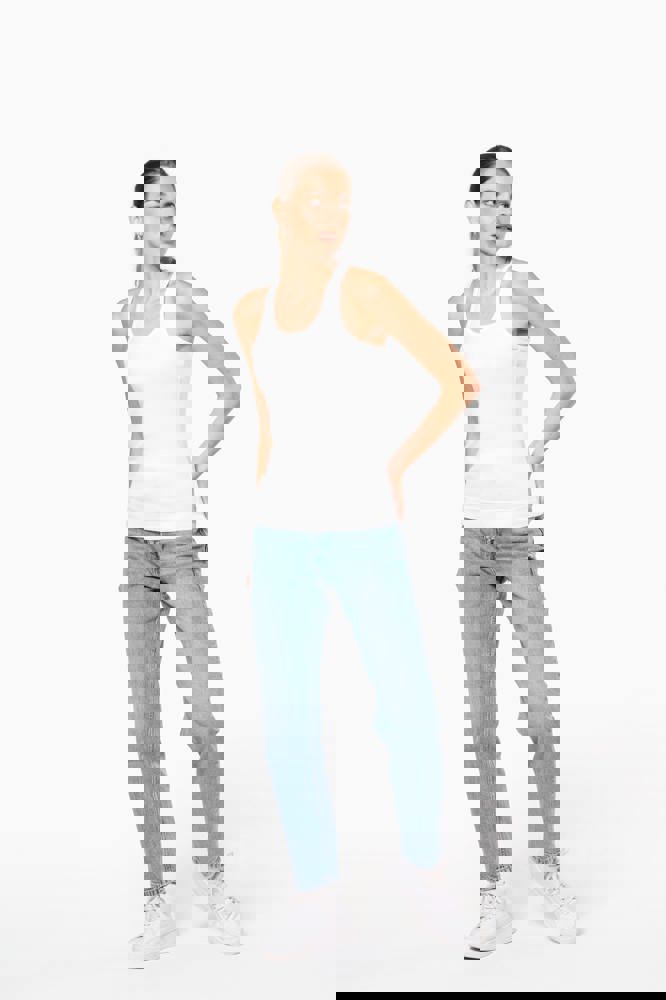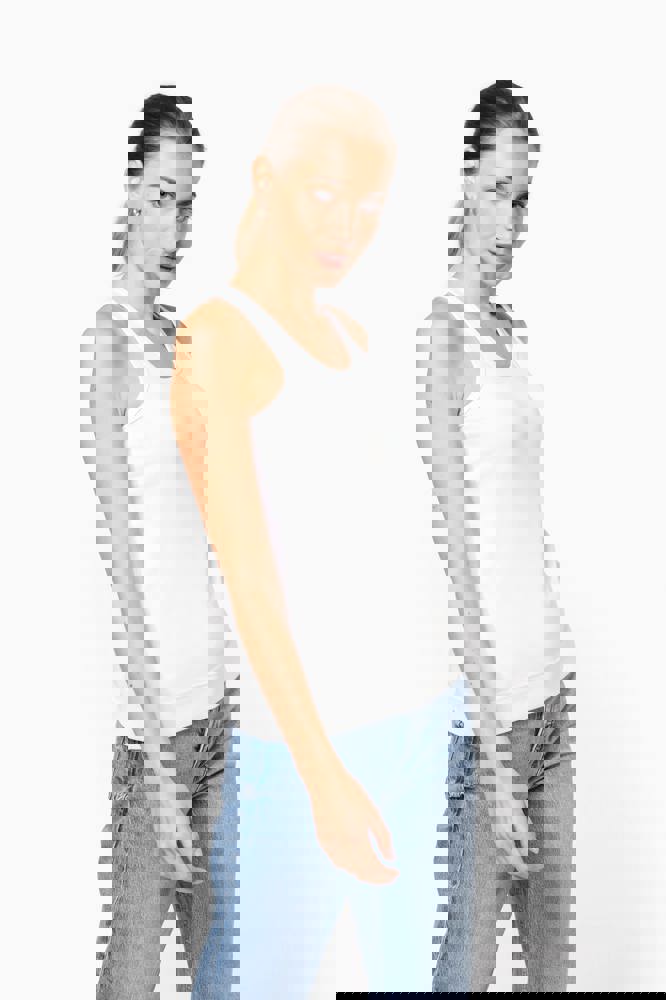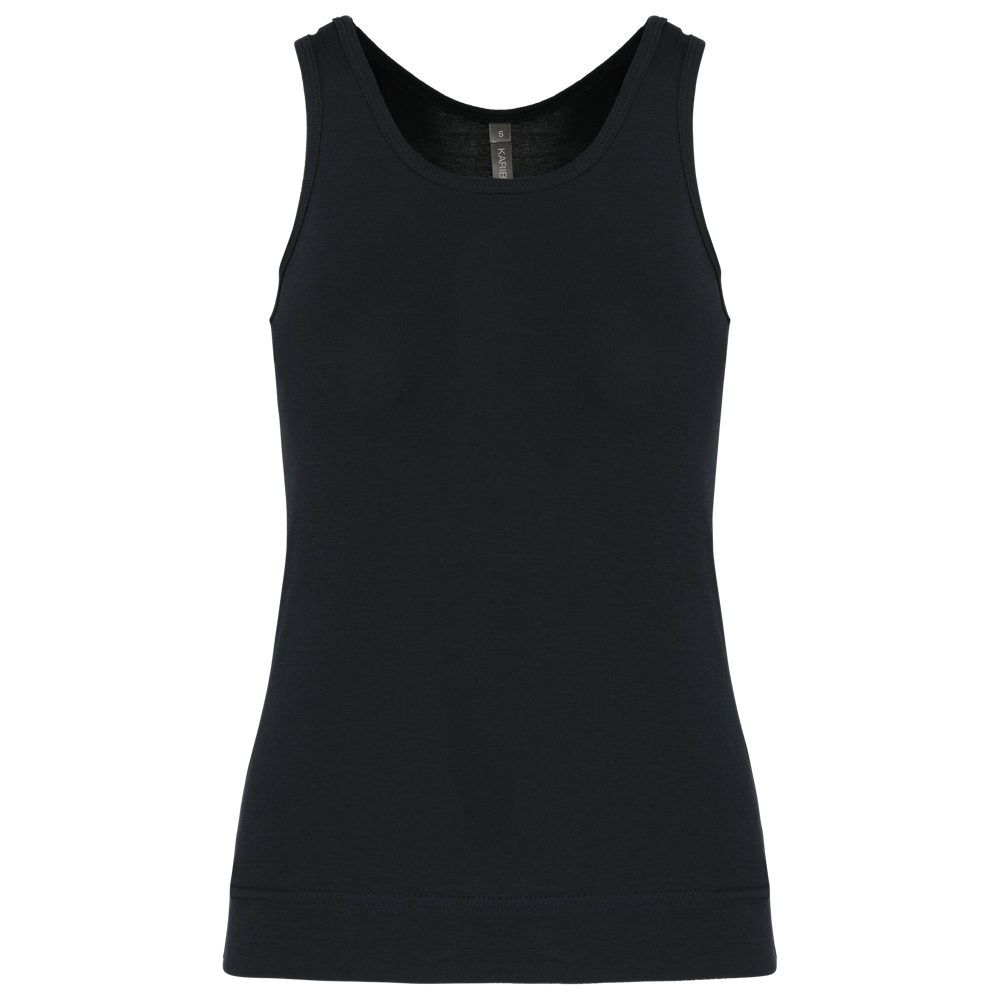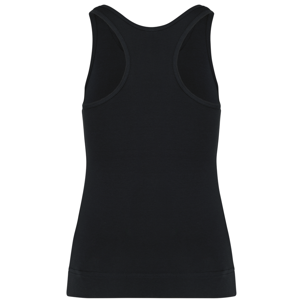 100% katoen 1x1 rib. Racerback. Afwerking met dubbele stiksels.