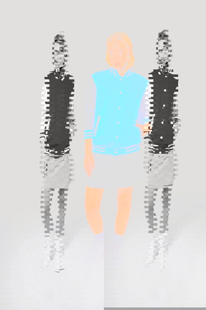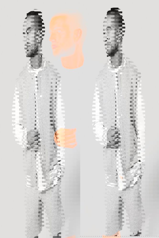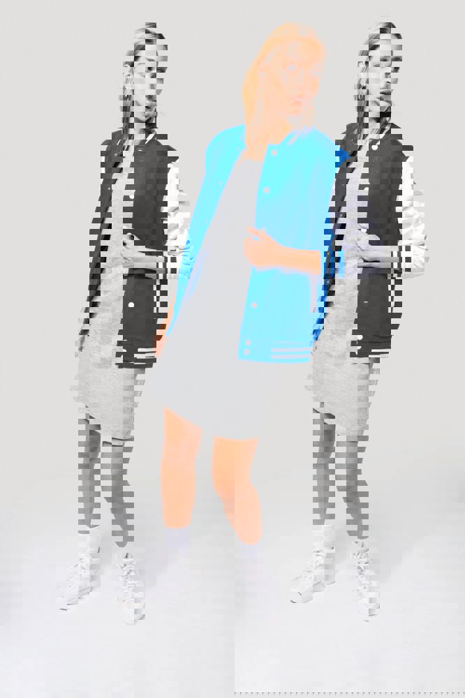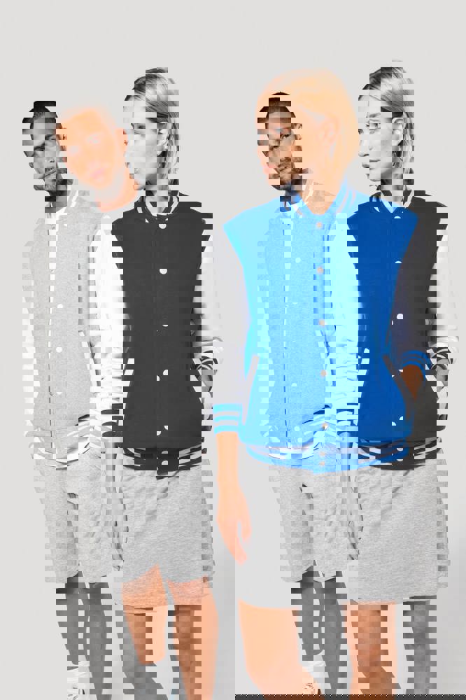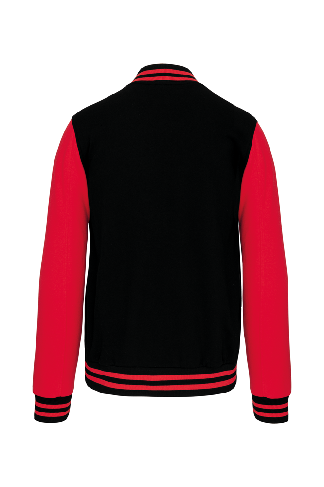 70% katoen / 30% polyester. Geborsteld fleece 3 draden. Contrasterende ingezette mouwen. Sluiting aan de voorkant met contrasterende drukknopen. Ribboord met 2 contrasterende biesjes aan kraag, mouwen en onderkant. 2 contrasterende omzoomde zakken aan de voorkant. Nektape met visgraatmotief en ophanglus in de kraag. Geen merklabel in de kraag, maar enkel een maatlabel voor eenvoudige personalisatie. De legendarische college jacket gaat al vele jaren mee. Hij is alomtegenwoordig: van de straat tot de schoolbanken
