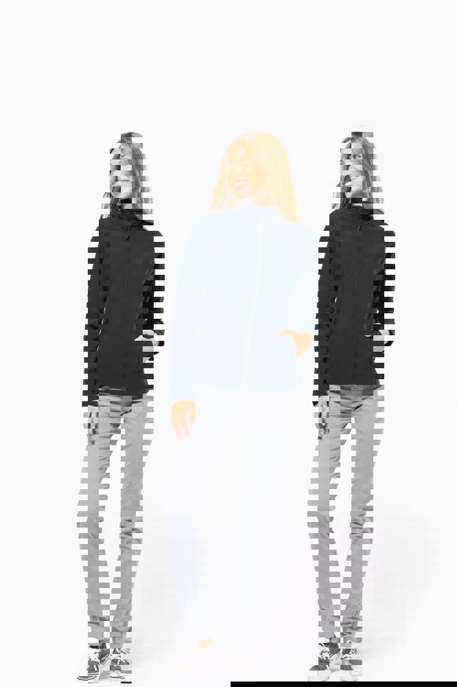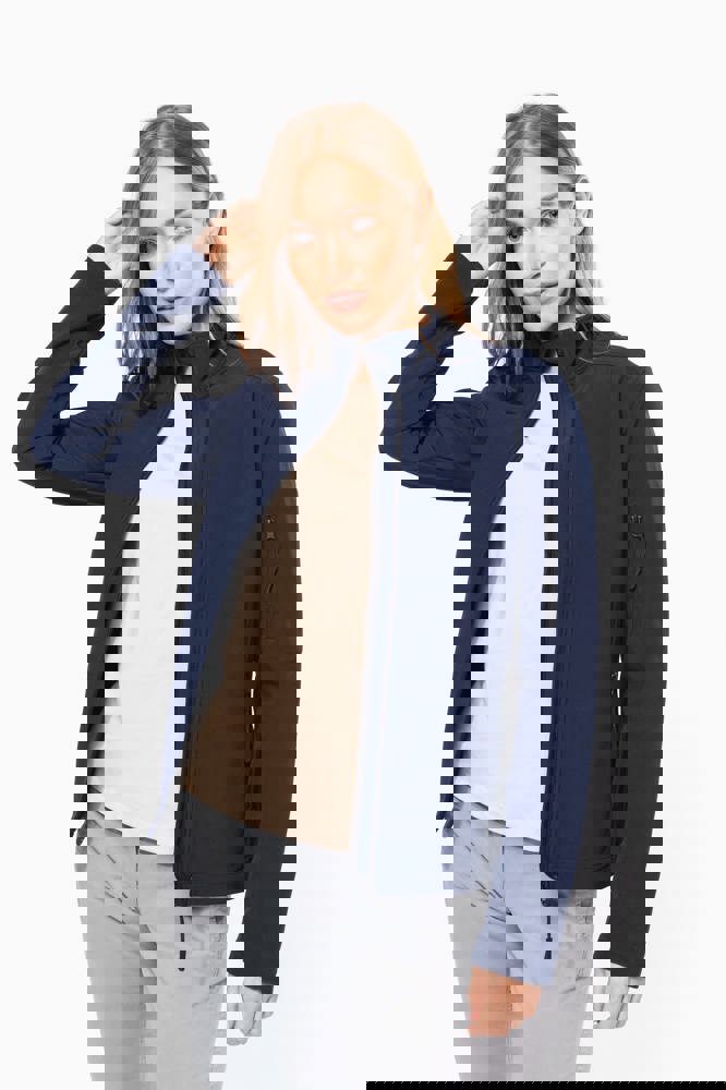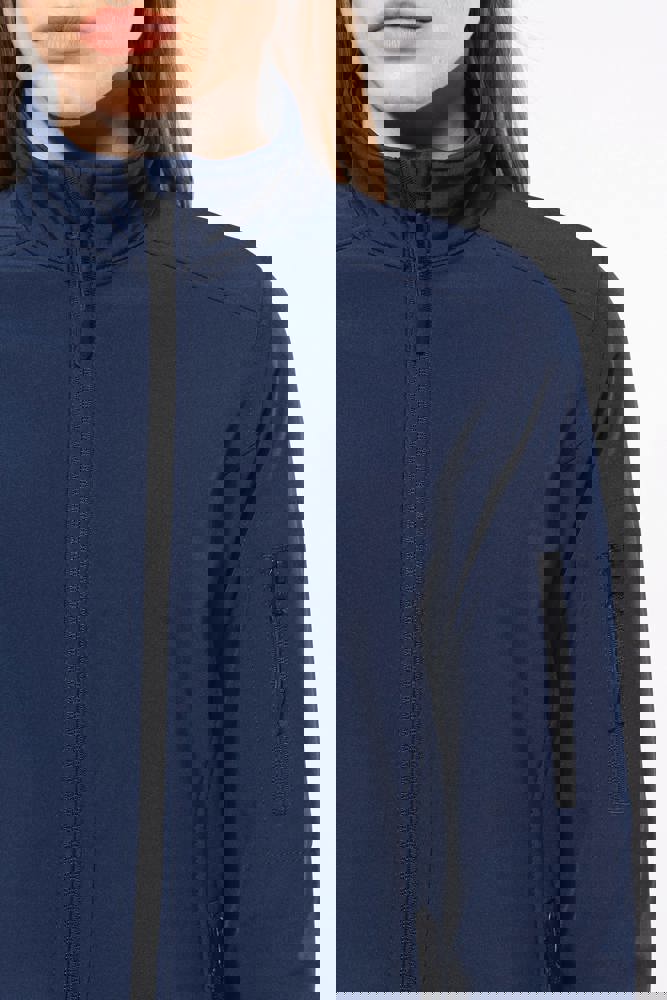 95% polyester / 5% elasthan. Stof in 3 lagen aan elkaar geklit, ademend 3000 g/m2/24H en 8000 mm waterdicht. Buitenkant: 95% polyester / 5% elasthan. Tussenlaag: ademend membraan. Binnenkant: microfleece. Getailleerde snit. Ritssluiting. Zakken met rits aan de voorkant. 1 zak met rits op de linkermouw.