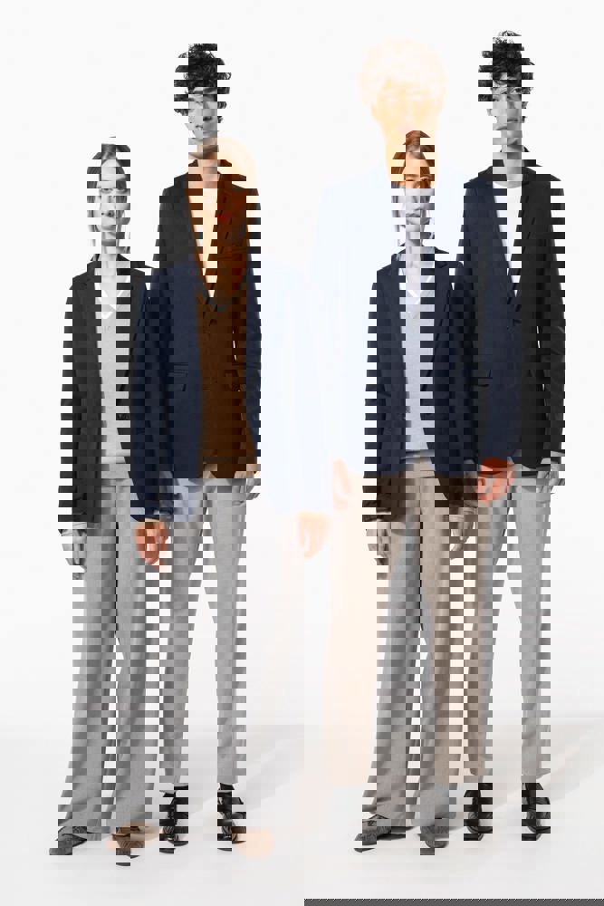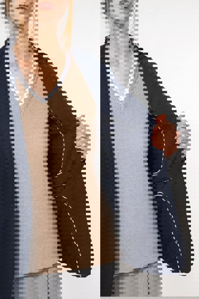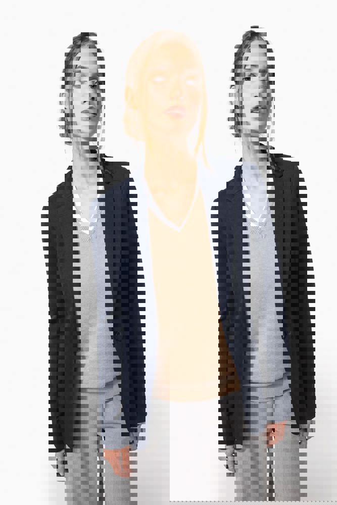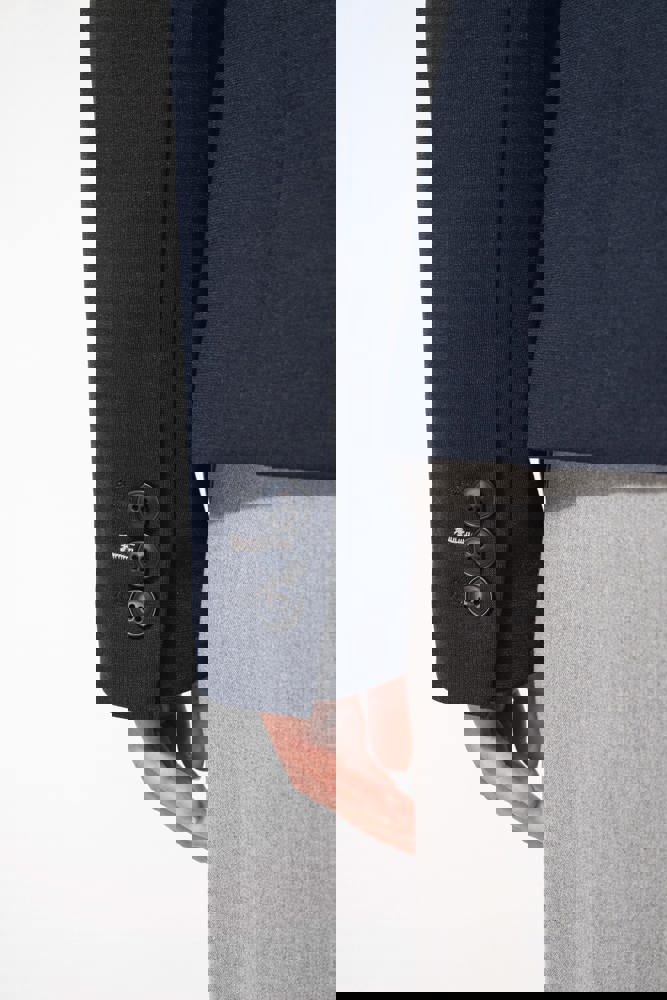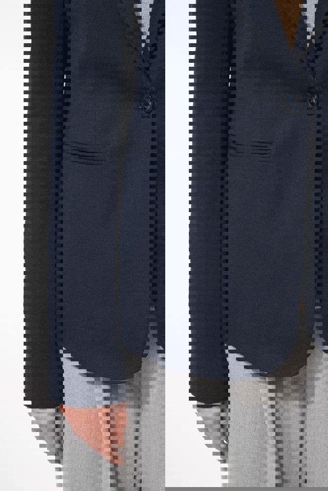 80% polyester / 18% katoen / 2% elasthan (Night navy heather) - 74% polyester / 24% viscose / 2% elasthan (Light grey heather). Interlock. Voering lichaam van polykatoen en mouwen van taffetas polyester. Jas met 1 knoop. 2 omzoomde zakken aan de voorkant. 1 binnenzak met knoop. Contrasterende bies aan de binnenkant vooraan. Mouwuiteinde met 3 knopen, waarvan 1 met contrasterend knoopsgat. 1 ruimtesplit op de achterkant. 1 blinde drukkersrits binnenin aan de voorkant links.