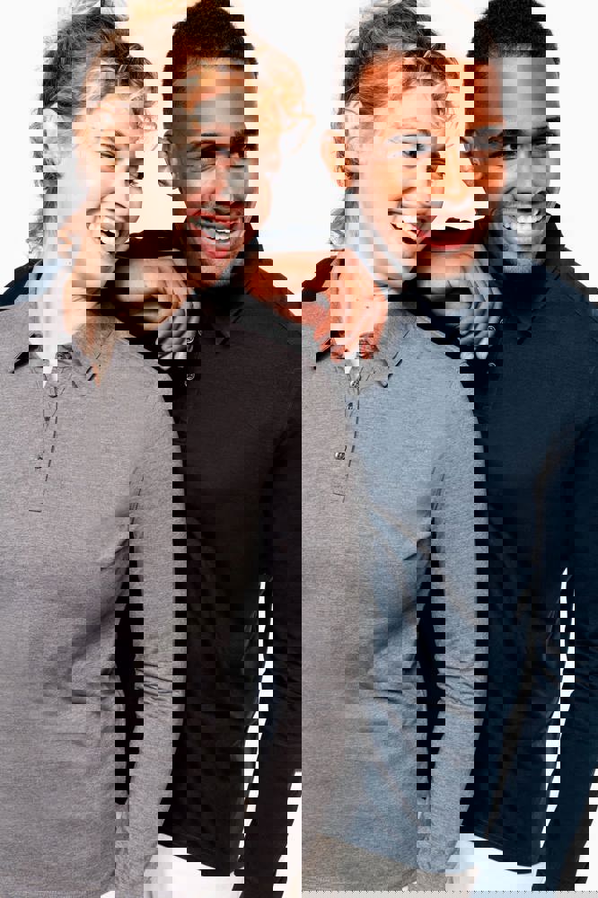 100% katoen (Heather Grey: 65% katoen / 35% polyester - Oxford Grey : 90% katoen / 10% viscose). Katoenen, gekamde jersey. Hemdskraag. Knooplijst met 4 metalen knopen. Inzetstuk op de schouder. Mouwuiteinden in ribboord. Dubbel stiksel aan de onderkant.