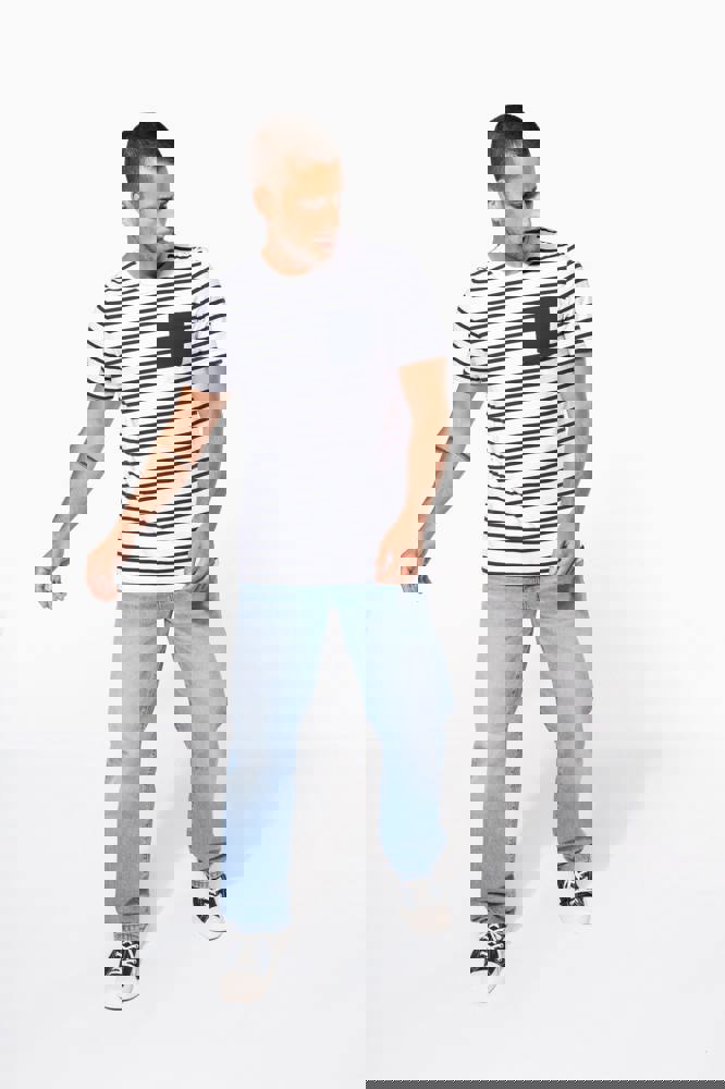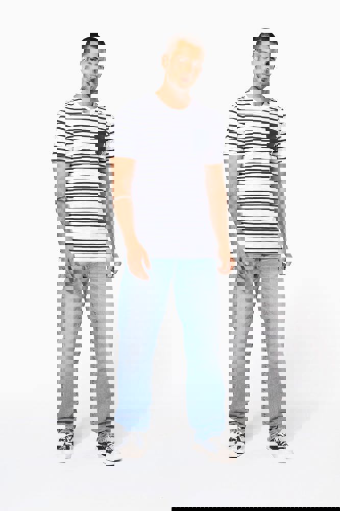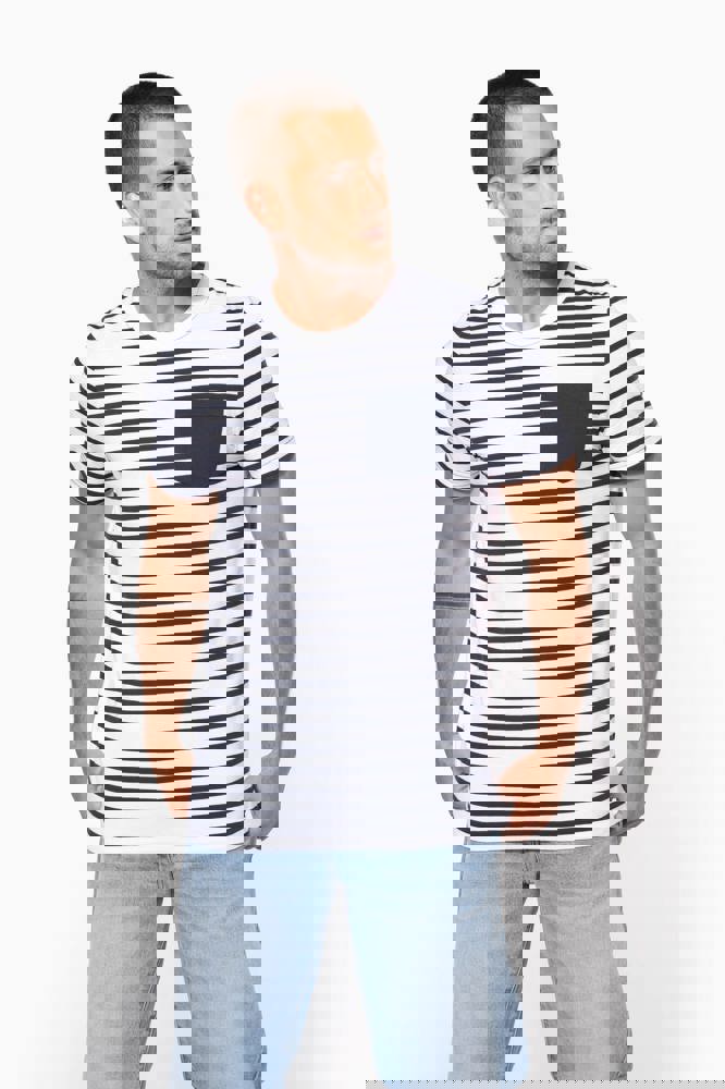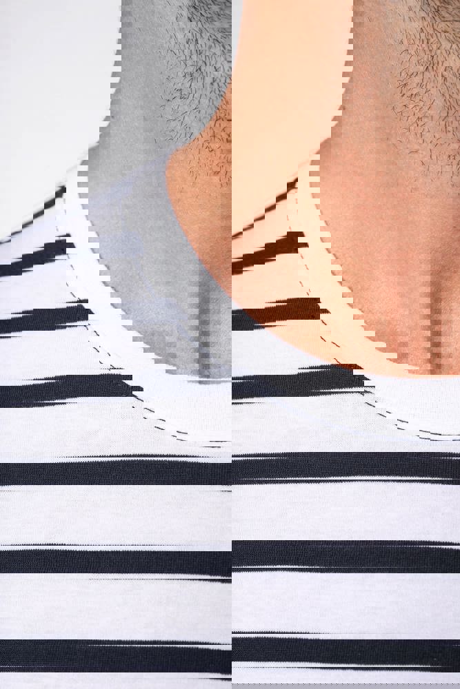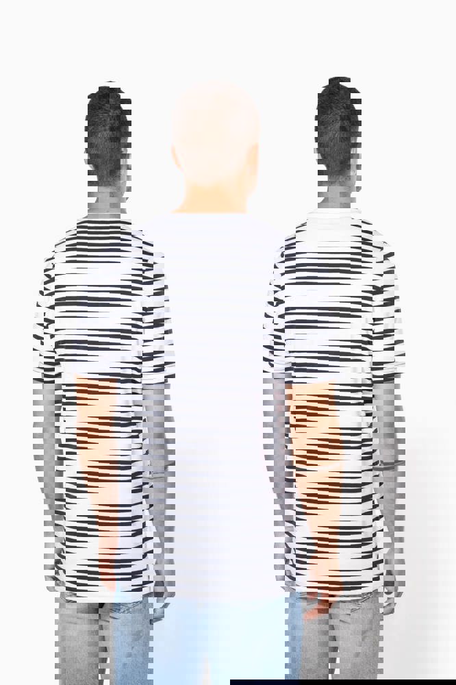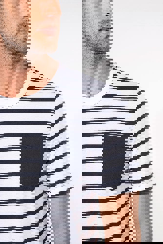 100% katoen. Gekamde katoenen jersey. Voelt zacht aan. Ronde hals in ribboord. Contrasterende borstzak aan de linkerkant. Contrasterende nektape. Dubbel stiksel aan mouwuiteinden en onderkant.