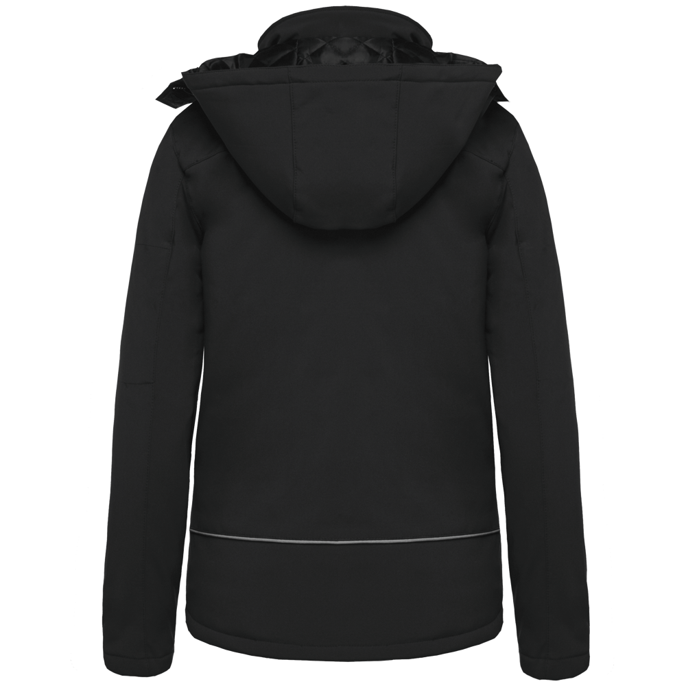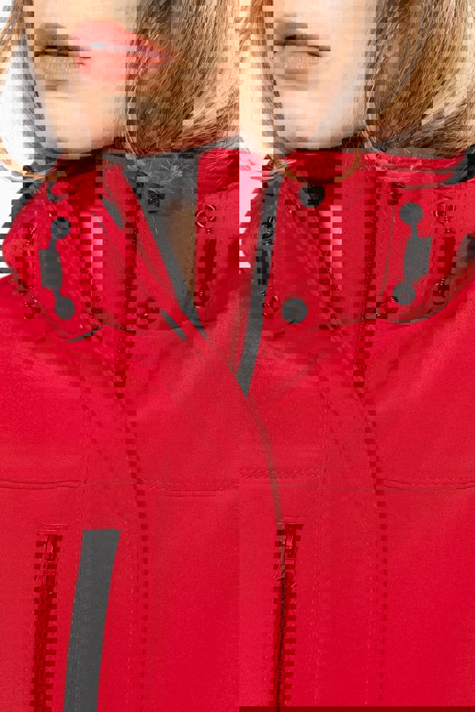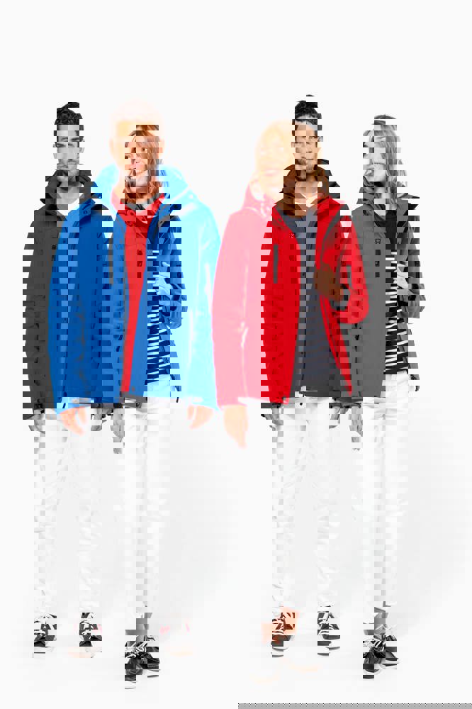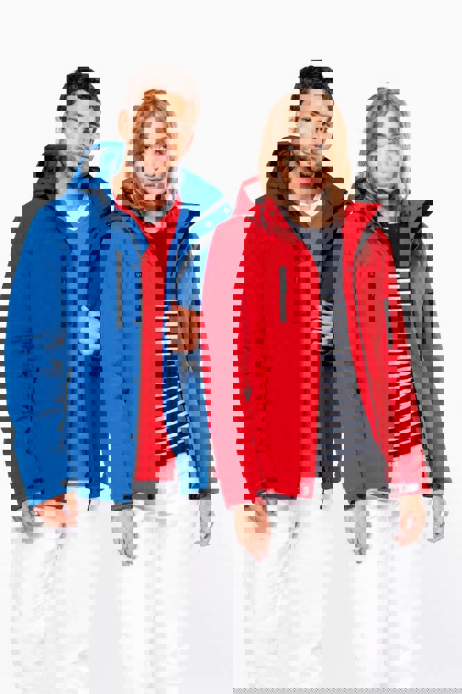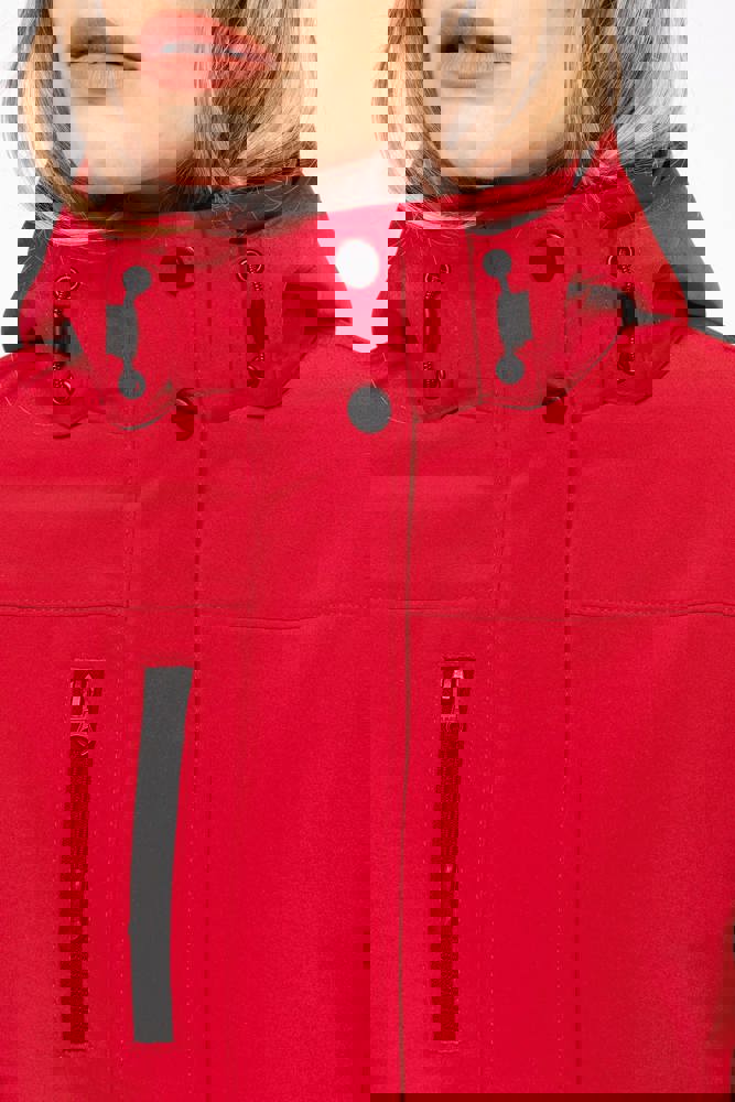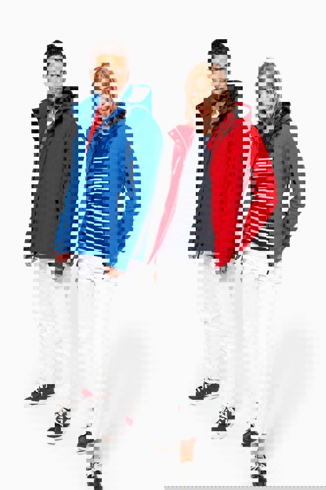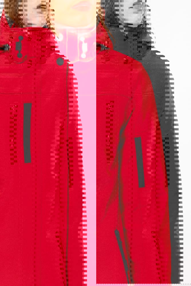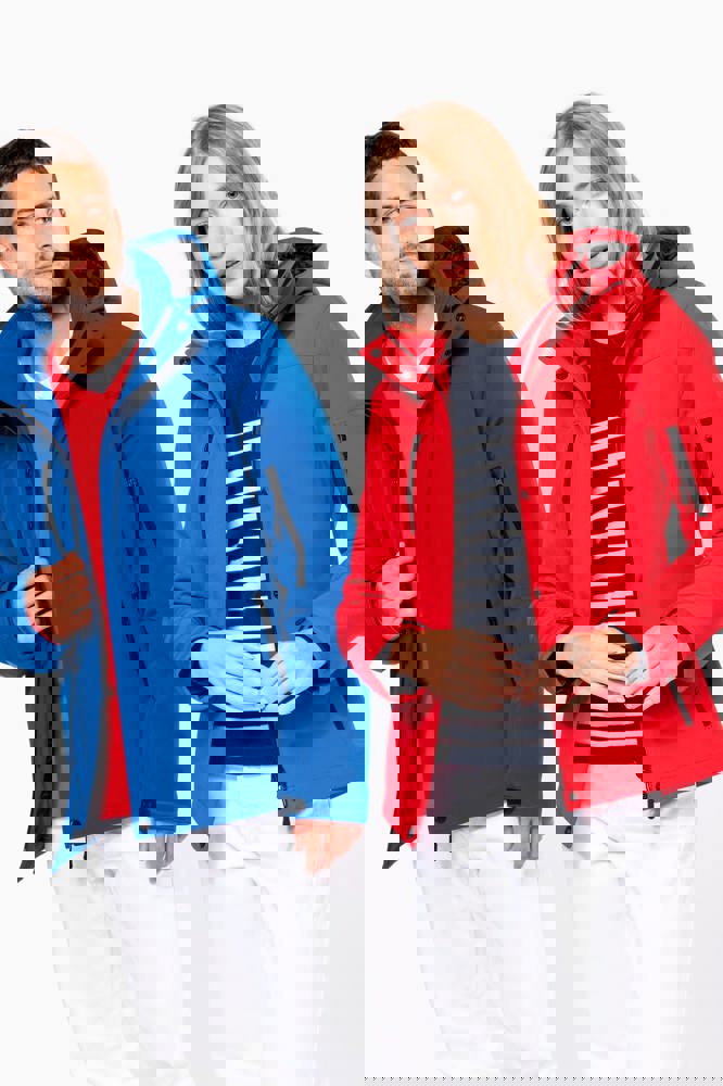 95% polyester / 5% elasthan. 3-laagse ademende stof 3000 g/m²/24 u en waterdicht 8000 mm. Buitenkant: 95% polyester / 5% elasthan. Tussenlaag: ademend membraan. Binnenlaag: microfleece. Gewatteerde voering van 100% polyester. Voorkant: 4 ritszakken (2 aan de zijkant, 1 op de mouw, 1 rechts op de borst). 2 binnenzakken met drukknoop. Afneembare capuchon met 3 gevoerde en gewatteerde panelen, regelbaar met stoppers. Met klittenband regelbare mouwuiteinden. 1 rits aan de linkerkant en 1 drukkersrits.