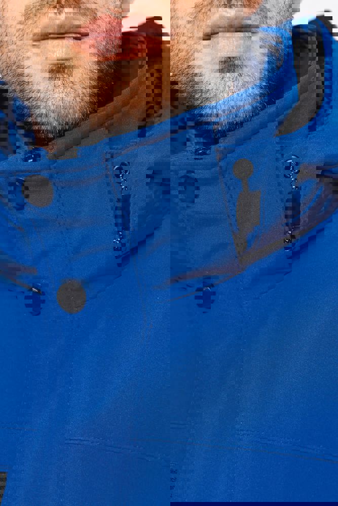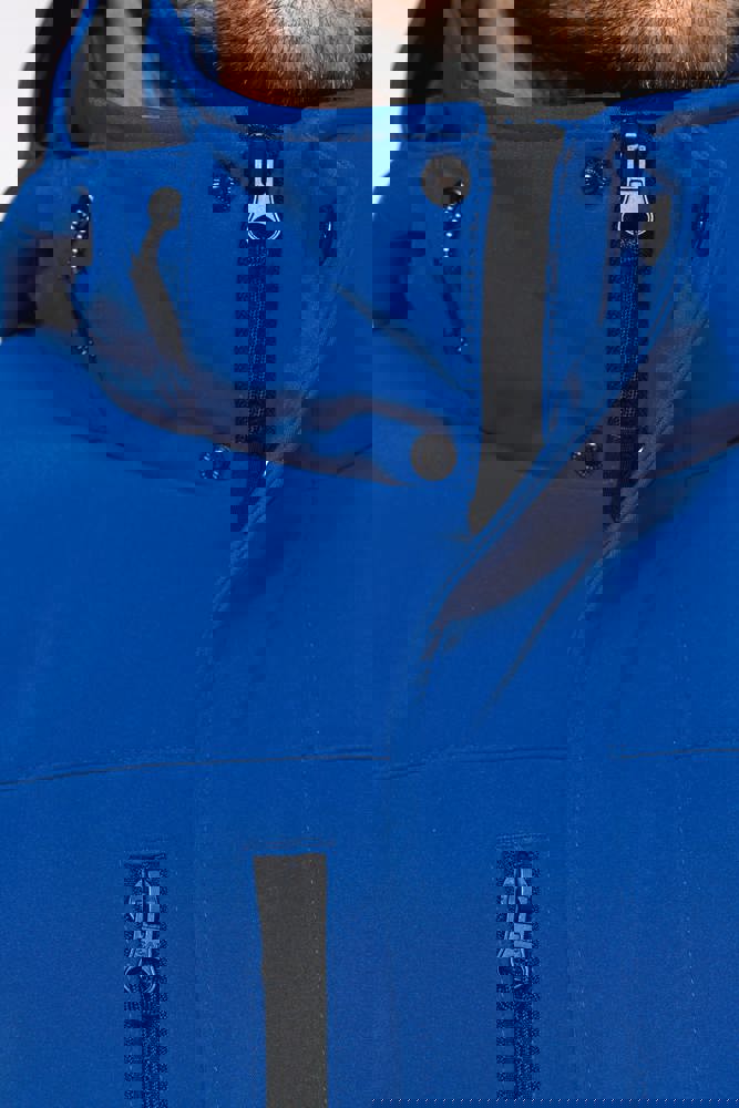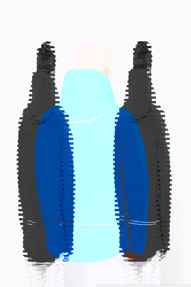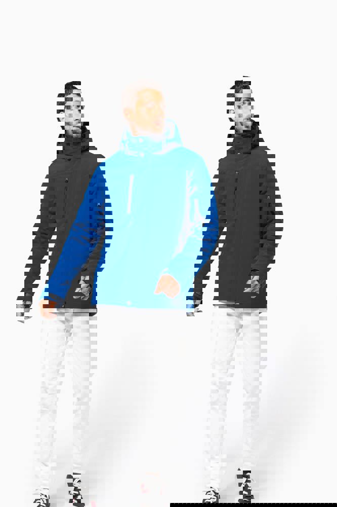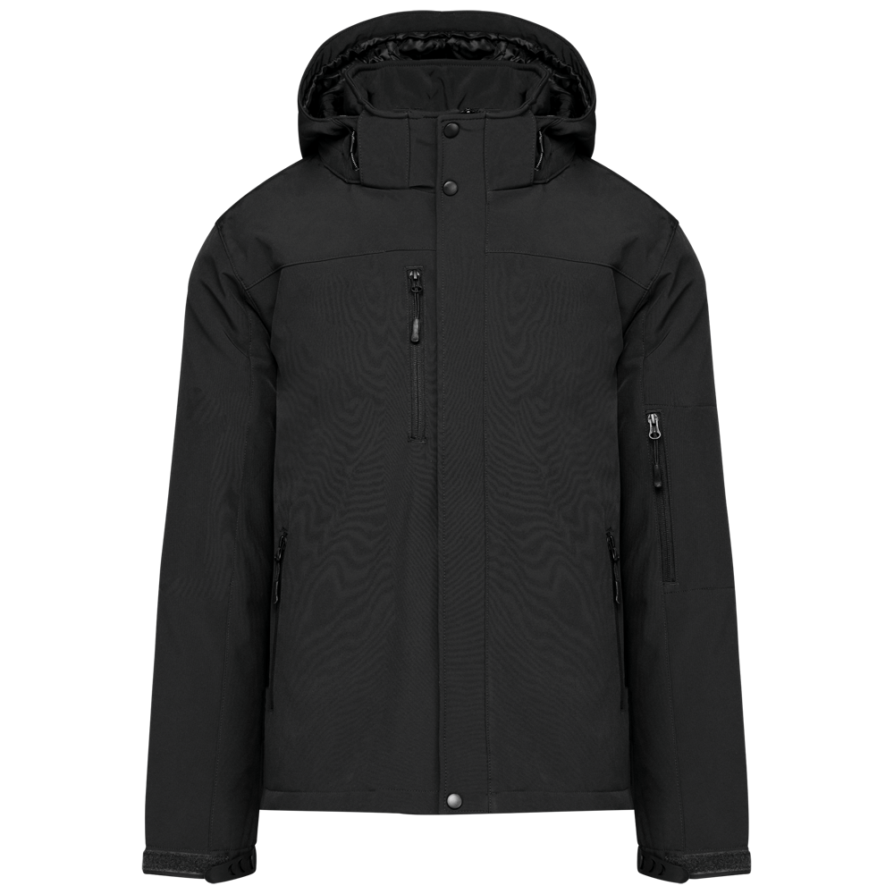 95% polyester / 5% elasthan. 3-laagse ademende stof 3000 g/m²/24 u en waterdicht 8000 mm. Buitenkant: 95% polyester / 5% elasthan. Tussenlaag: ademend membraan. Binnenlaag: microfleece. Gewatteerde voering van 100% polyester. Voorkant: 4 ritszakken (2 aan de zijkant, 1 op de mouw, 1 rechts op de borst). 2 binnenzakken met drukknoop. Afneembare capuchon met 3 gevoerde en gewatteerde panelen, regelbaar met stoppers. Met klittenband regelbare mouwuiteinden. 1 rits aan de linkerkant en 1 drukkersrits.