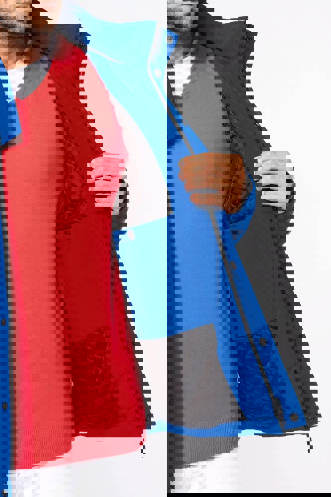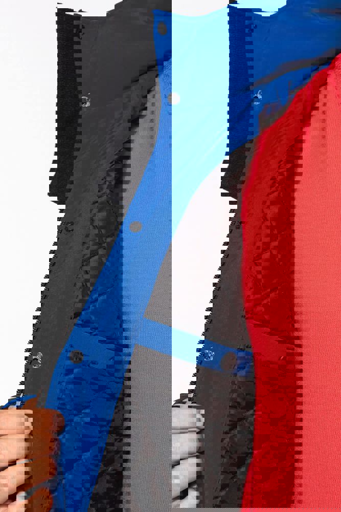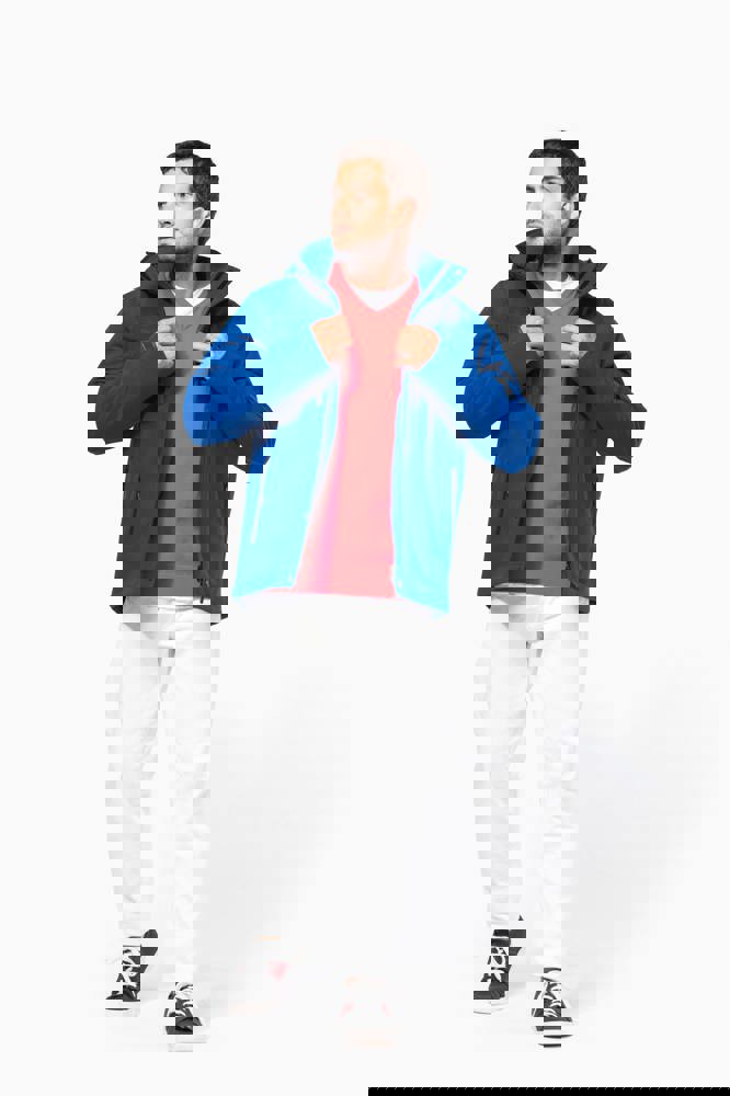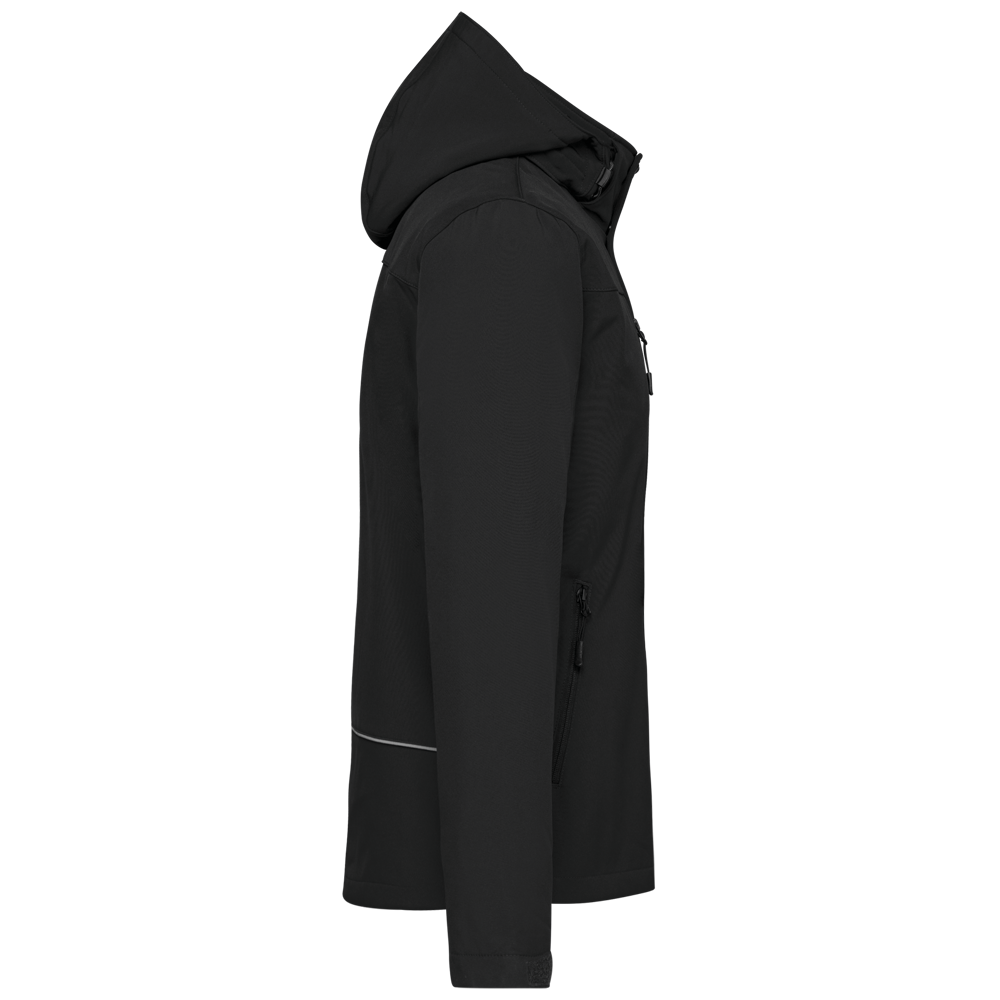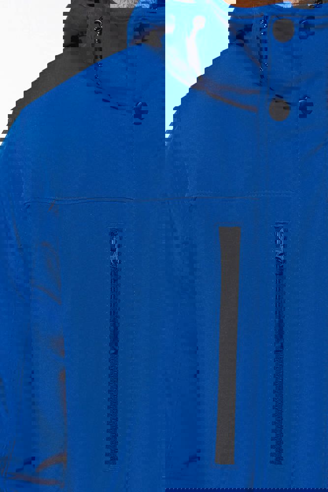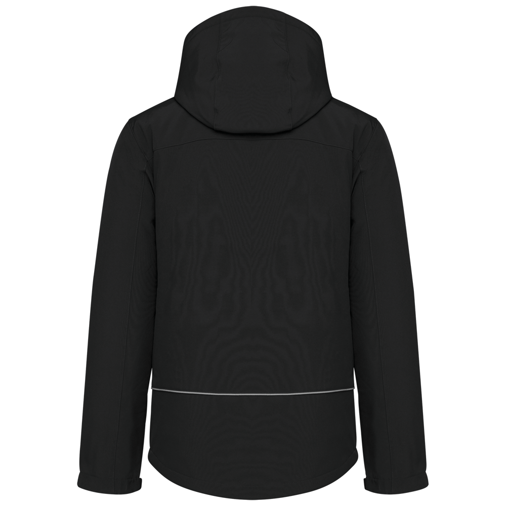 95% polyester / 5% elasthan. 3-laagse ademende stof 3000 g/m²/24 u en waterdicht 8000 mm. Buitenkant: 95% polyester / 5% elasthan. Tussenlaag: ademend membraan. Binnenlaag: microfleece. Gewatteerde voering van 100% polyester. Voorkant: 4 ritszakken (2 aan de zijkant, 1 op de mouw, 1 rechts op de borst). 2 binnenzakken met drukknoop. Afneembare capuchon met 3 gevoerde en gewatteerde panelen, regelbaar met stoppers. Met klittenband regelbare mouwuiteinden. 1 rits aan de linkerkant en 1 drukkersrits.