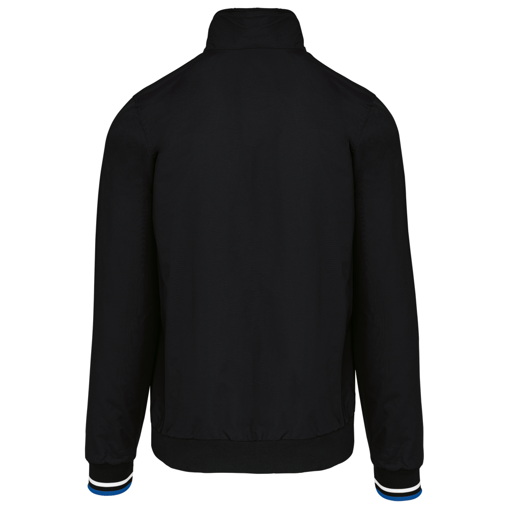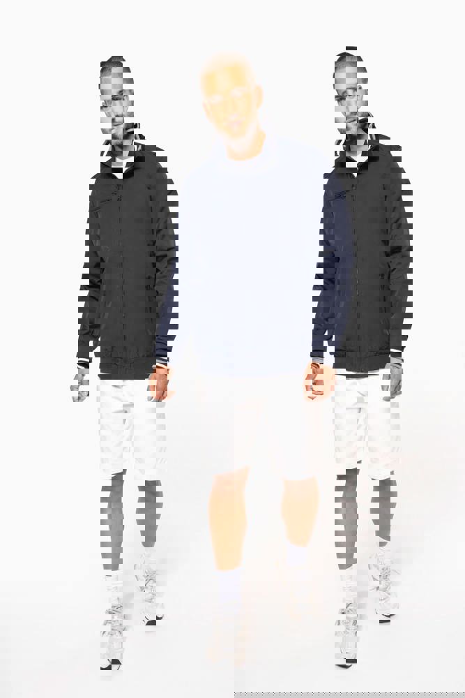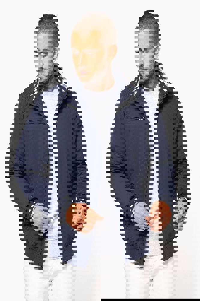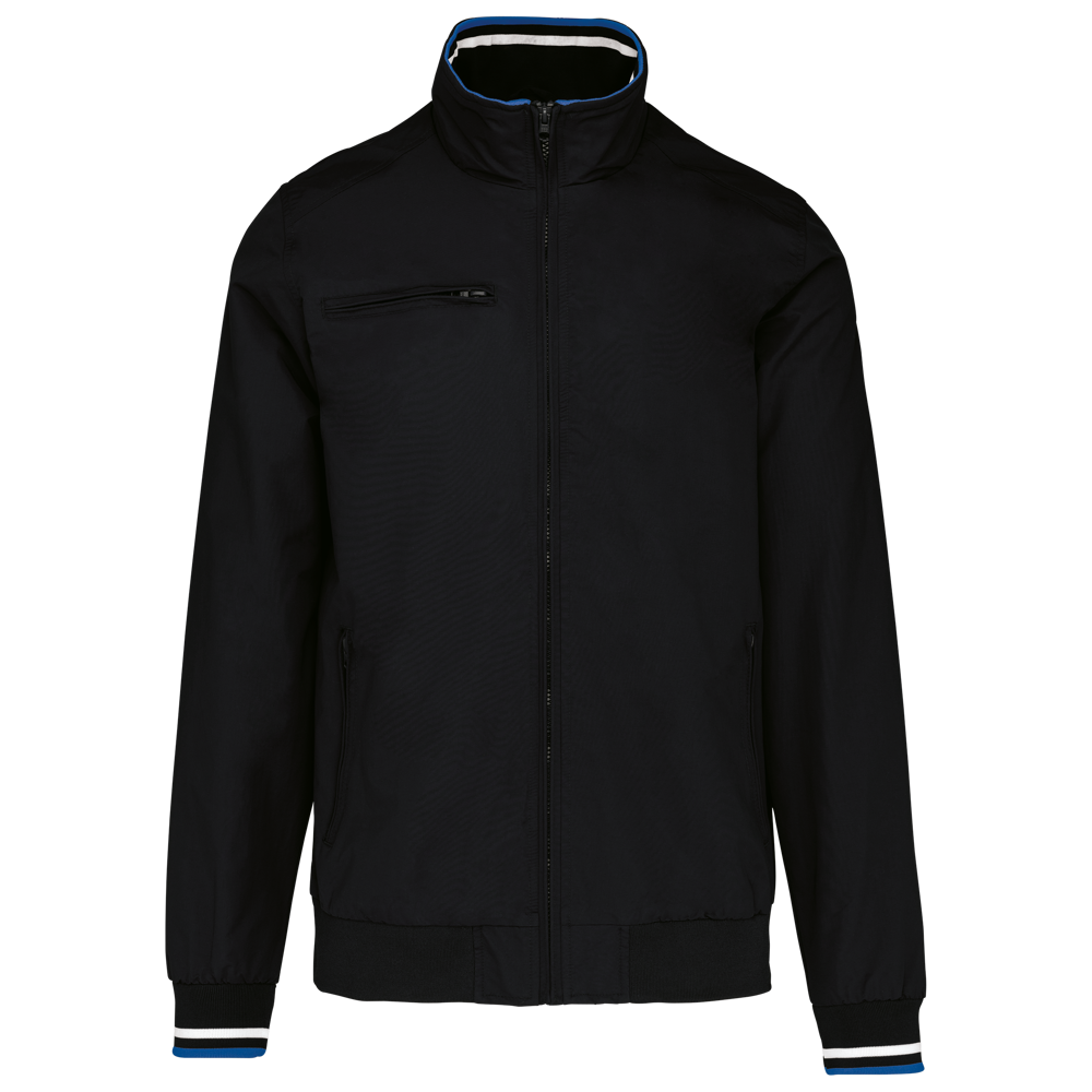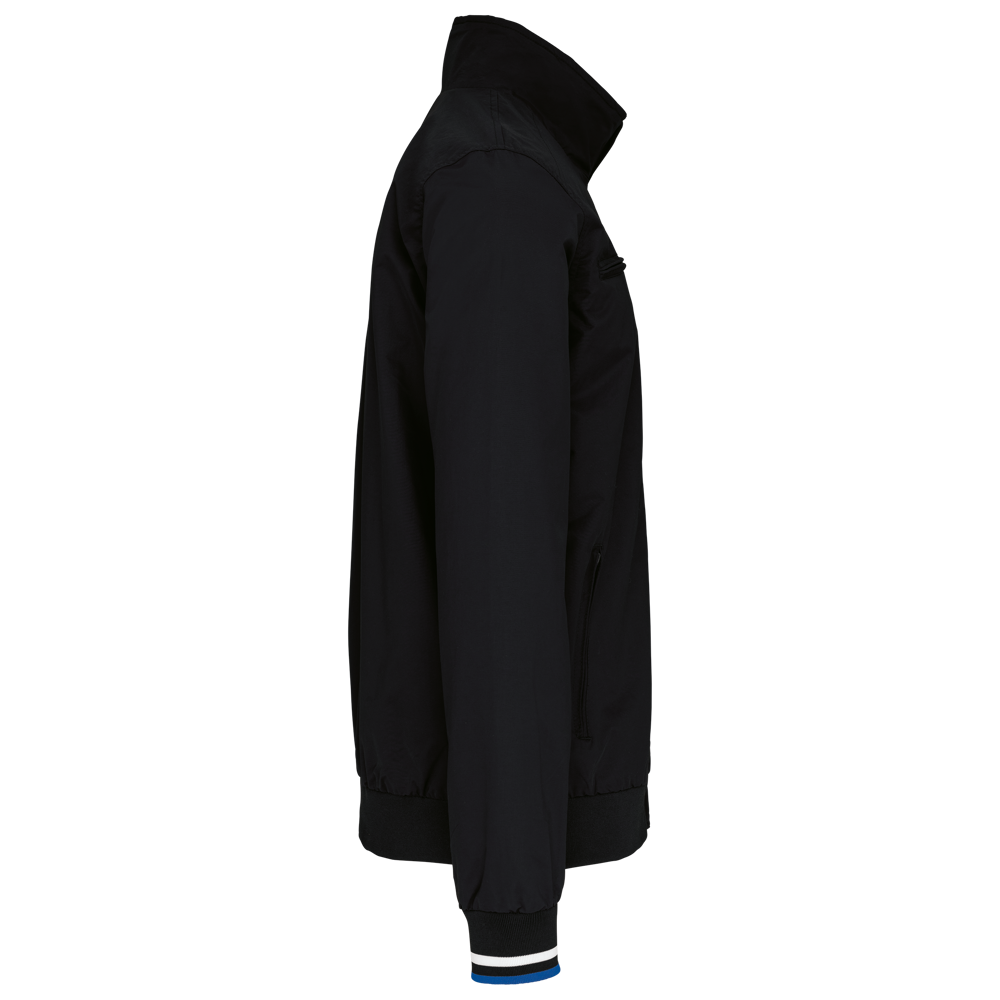 100% polyamide ottomaans taslon. Netvoering 100% polyester. Duurzame stof. 2 voorzakken met rits. 1 borstzak met rits. 1 binnenzak. Binnenkant kraag van in rib met geconstrasteerde strepen. Meshvoering met drukkersrits. Onderkant in rib. Mouwuiteinden in rib met gecontrasteerde strepen.