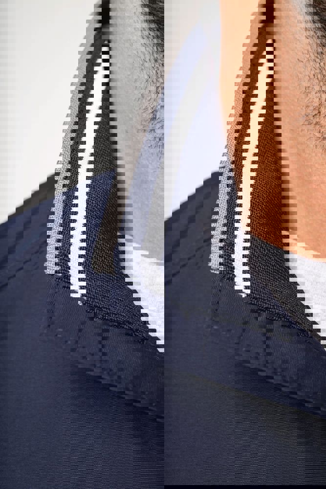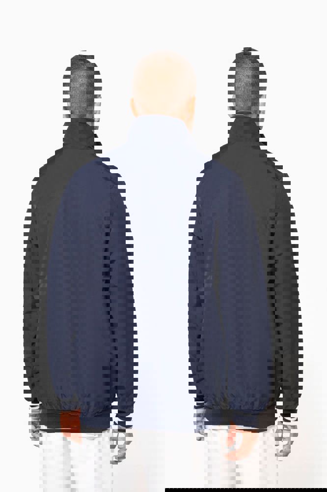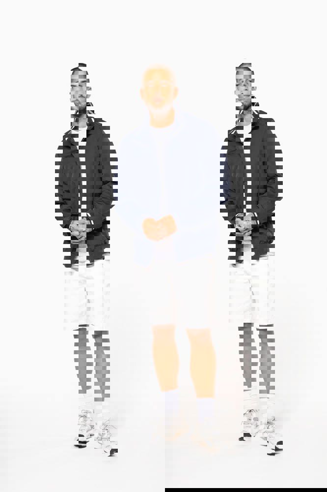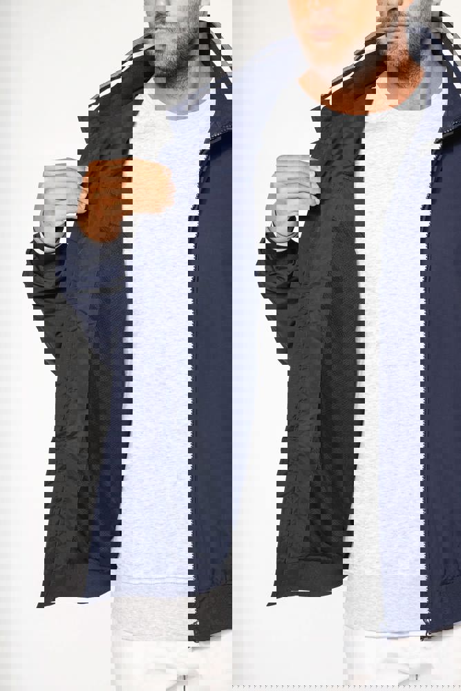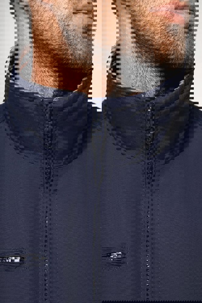 100% polyamide ottomaans taslon. Netvoering 100% polyester. Duurzame stof. 2 voorzakken met rits. 1 borstzak met rits. 1 binnenzak. Binnenkant kraag van in rib met geconstrasteerde strepen. Meshvoering met drukkersrits. Onderkant in rib. Mouwuiteinden in rib met gecontrasteerde strepen.