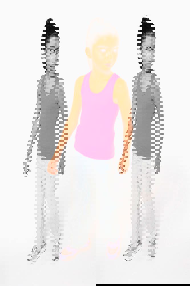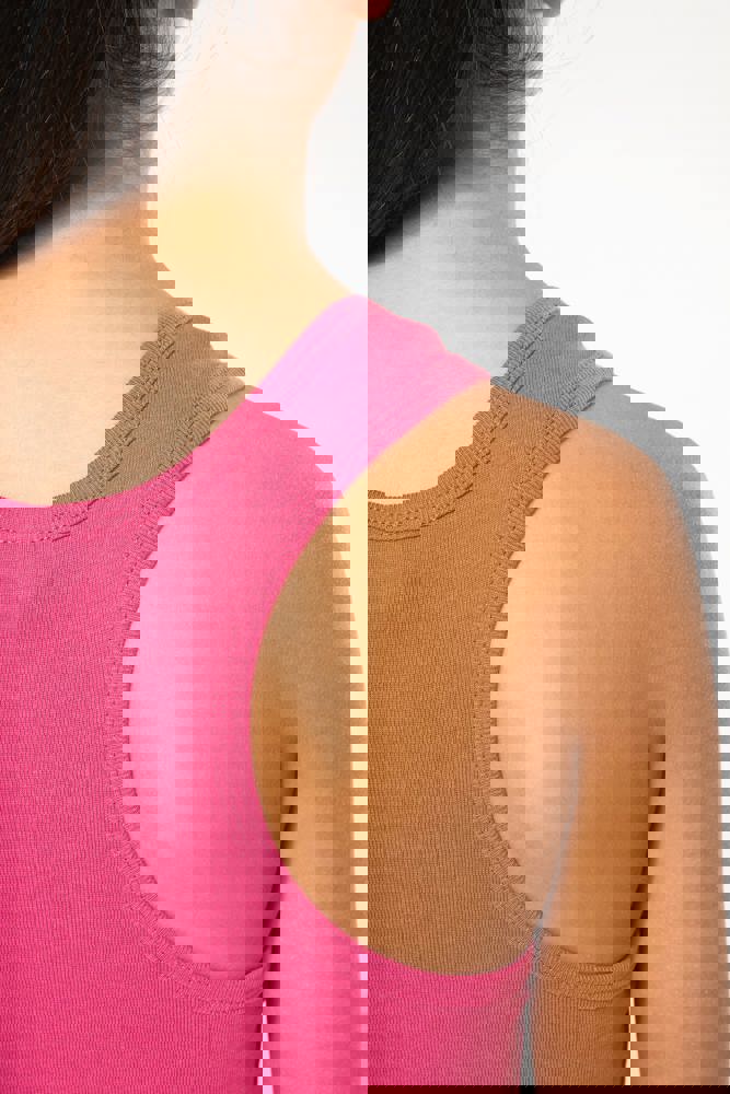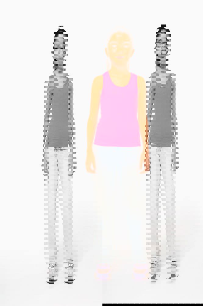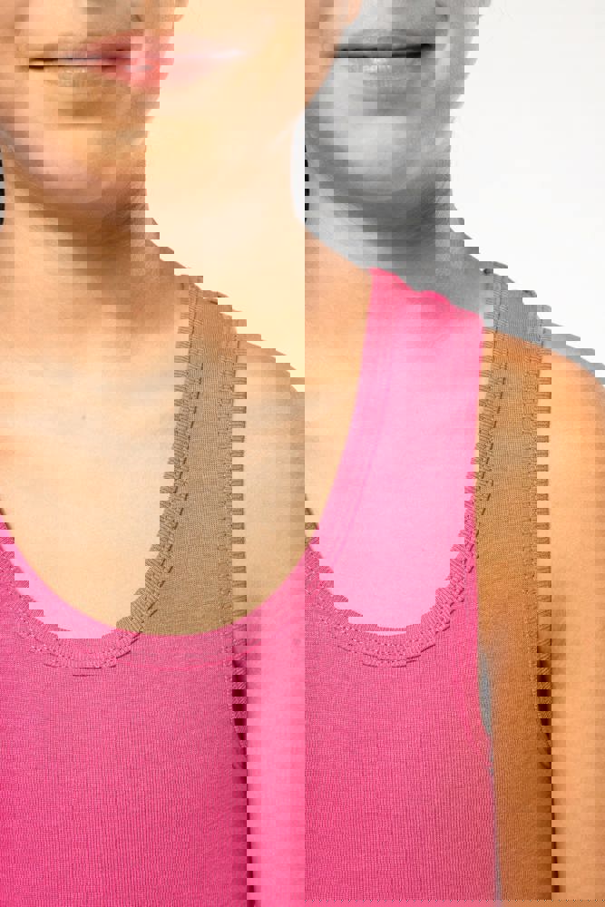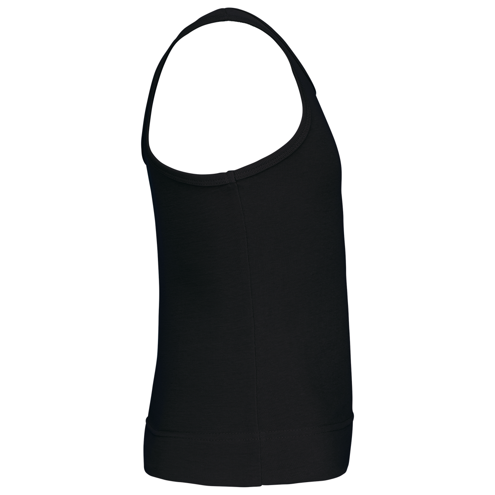 100% katoen. 1x1 rib. Racerback. Afwerking met dubbele stiksels.