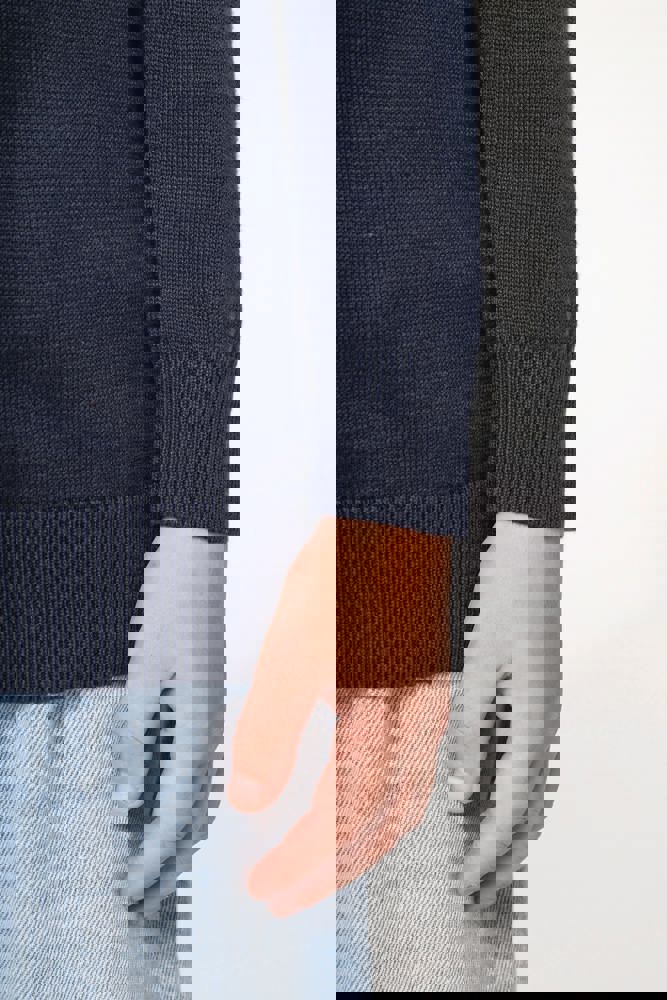 50% katoen / 50% acryl. Acryl gauge 12. Ribboord met dubbele dikte aan de kraag. Nektape. Ribboord aan mouwuiteinden en onderkant.