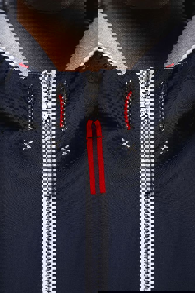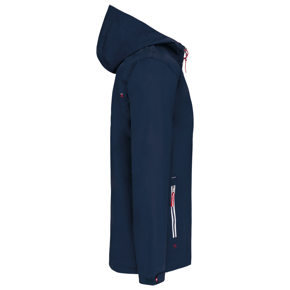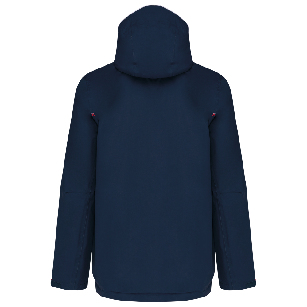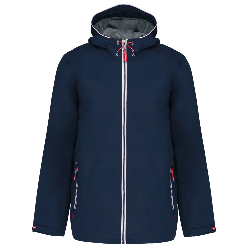 100% polyamide. Ademend 5000g/m2/24h. Waterdicht tot 3000mm. Waterdichte getapete naden. Ritssluiting. 2 voorzakken met rits. 1 binnenzak. Polyester voering in contrastkleur. Verstelbare capuchon met mesh voering. Drukkersrits onderaan en ter hoogte van de borst.