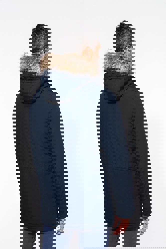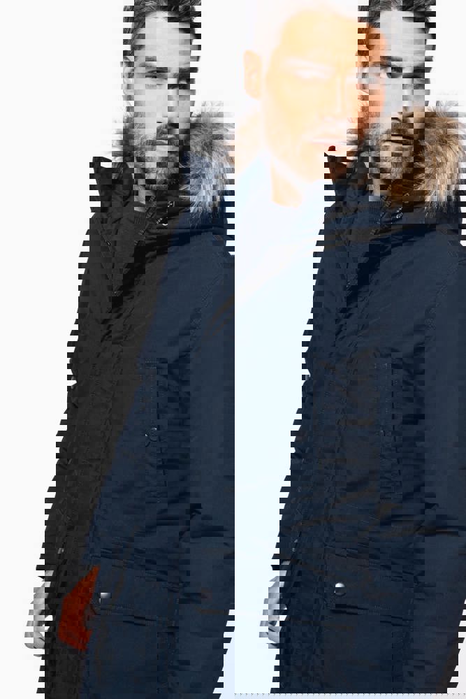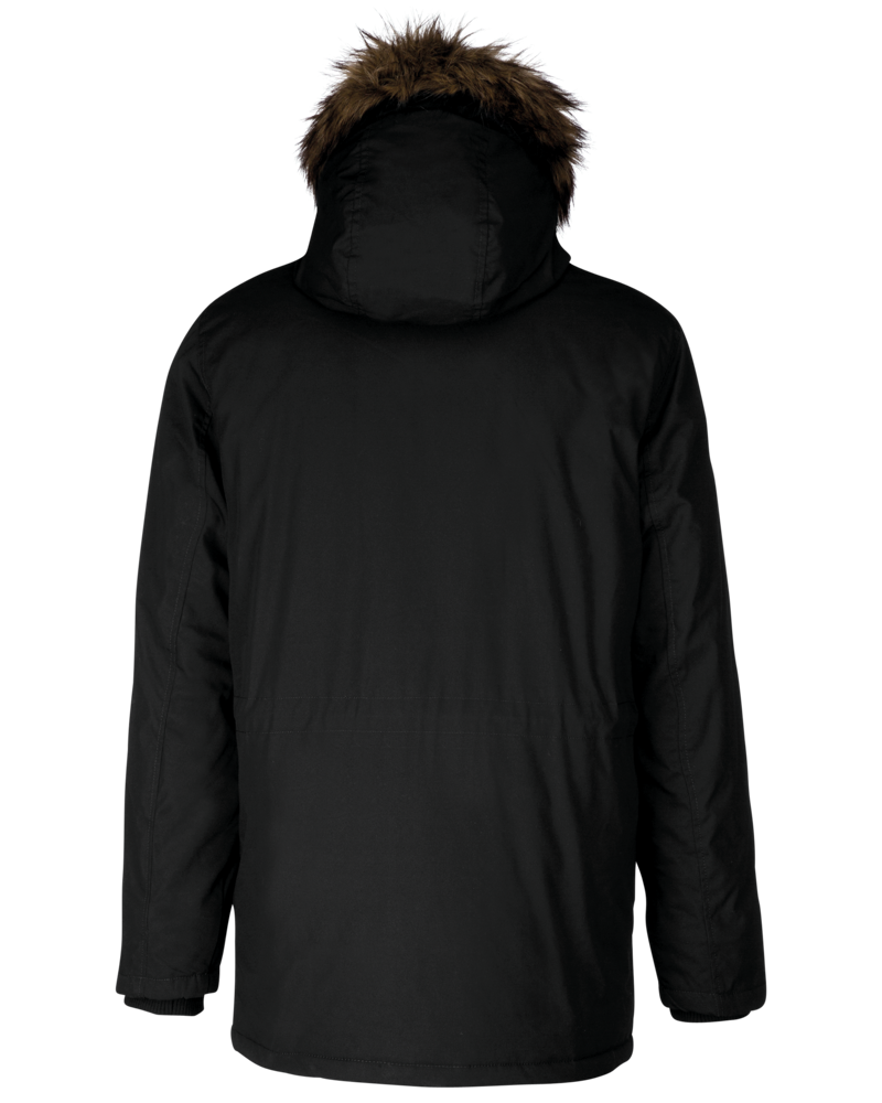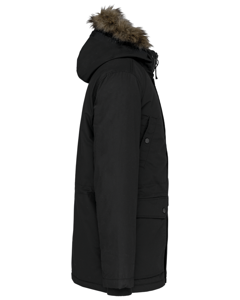 Dik canvas van 65% polyester / 35% katoen. Gewatteerde voering van 100% polyester. Verborgen ritssluiting onder een drukknooplijst. Gawatteerde en gevoerde capuchon met afneembaar nepbont. 4 buitenzakken aan de voorkant: 2 grote zakken met dubbele opening met klep met drukknoop en 2 omzoomde borstzakken met drukknoop. 1 binnenzak met klittenbandsluiting. Taille verstelbaar met aanrijgkoordjes binnenin. Mouwuiteinden in ribboord aan de binnenzijde. 1 rits aan de linkerkant en 1 drukkersrits.