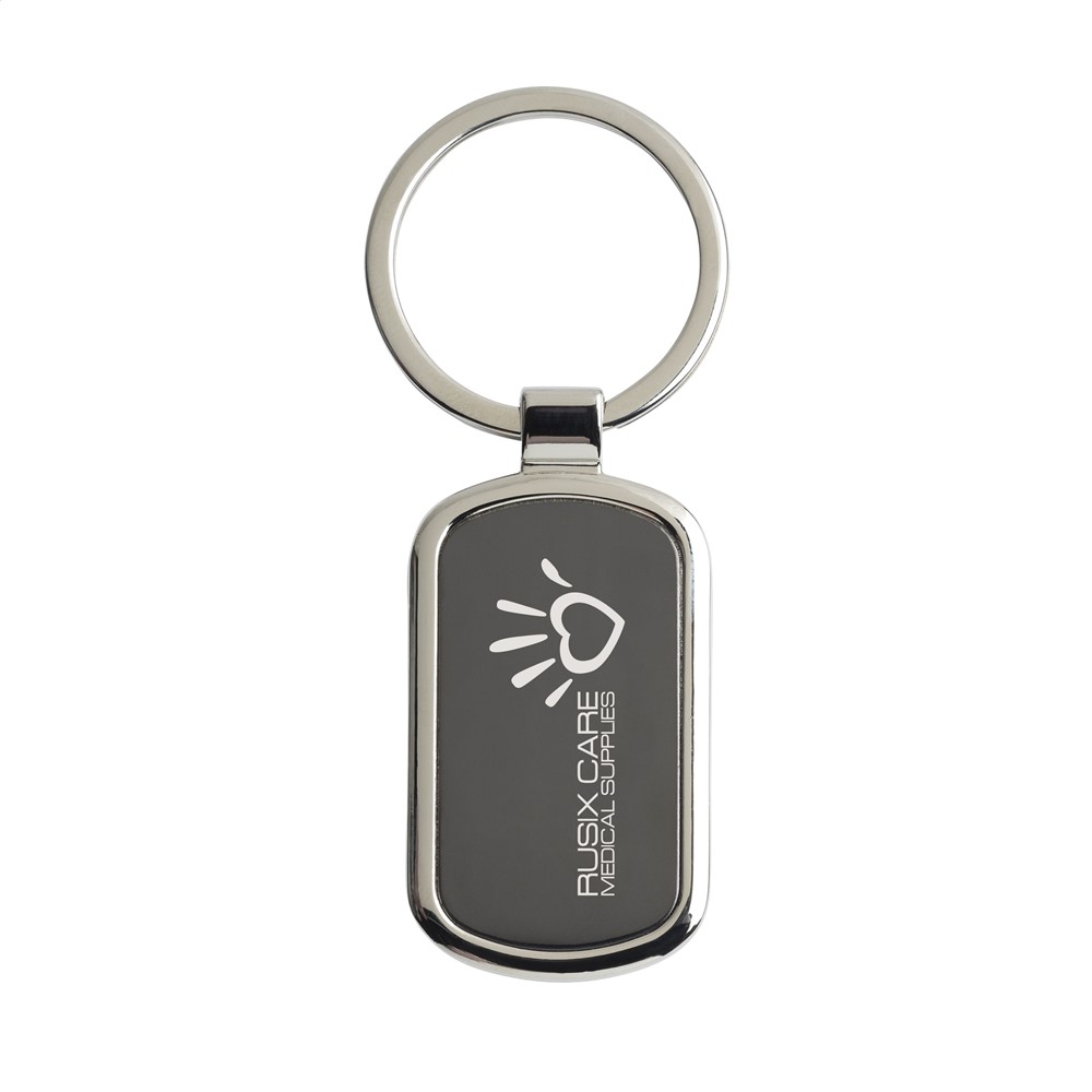 Rechthoekige, hoogglans, nikkelen sleutelhanger met zwart metalen inlay en stevige sleutelring. Chic en exclusief. Per stuk verpakt.