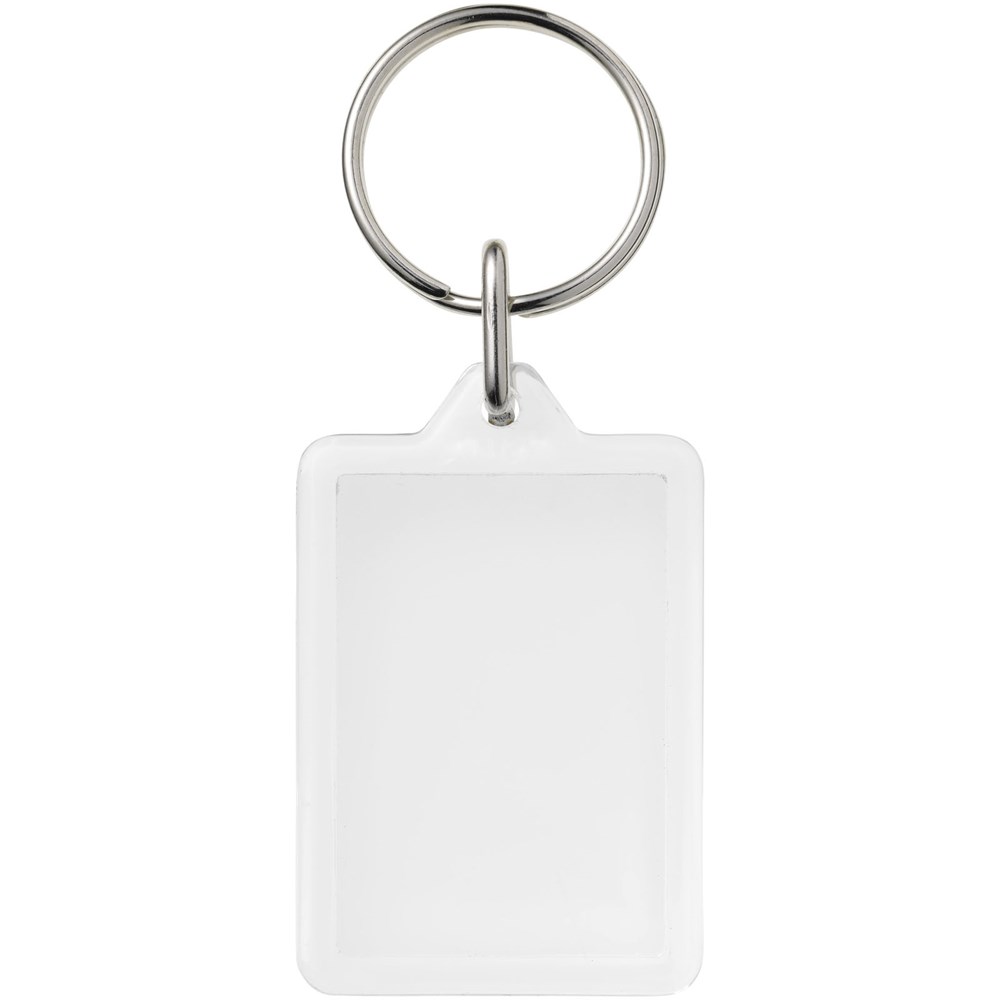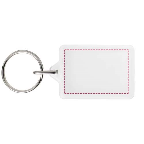 Oorzichtige rechthoekige Y1 sleutelhanger met metalen sleutelring . De metalen lusring biedt een vlak profiel dat ideaal is voor de post. Afmetingen van het te bedrukken inzetstuk: 3,5 cm x 2,4 cm.