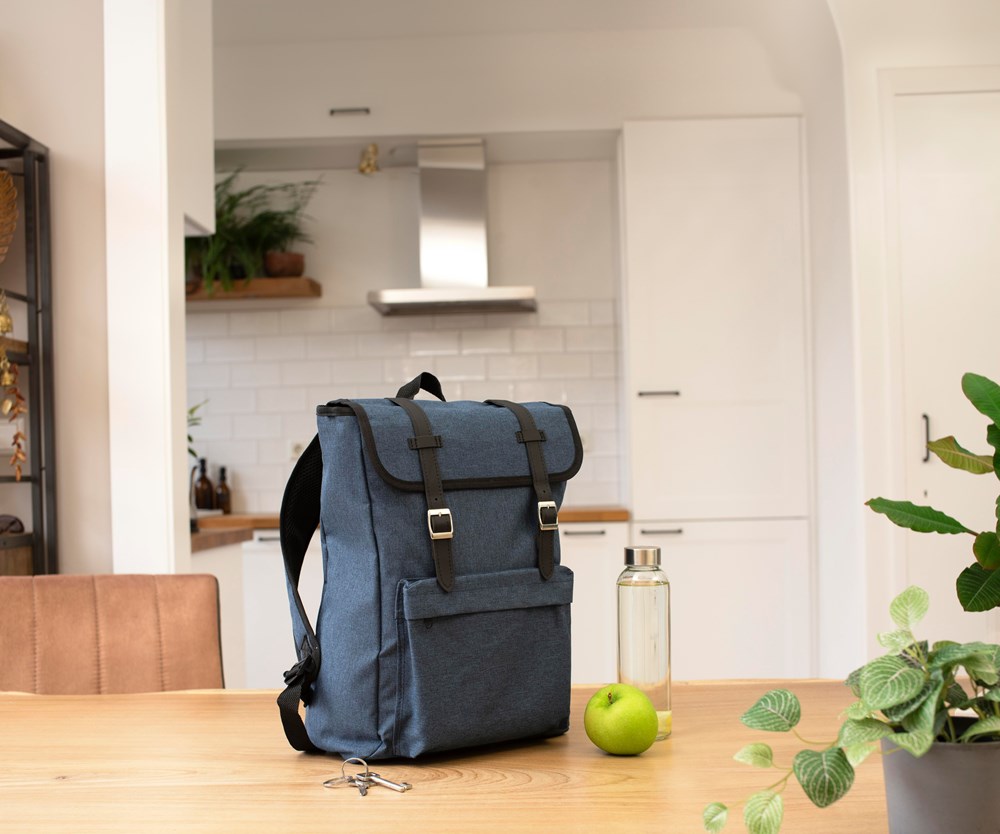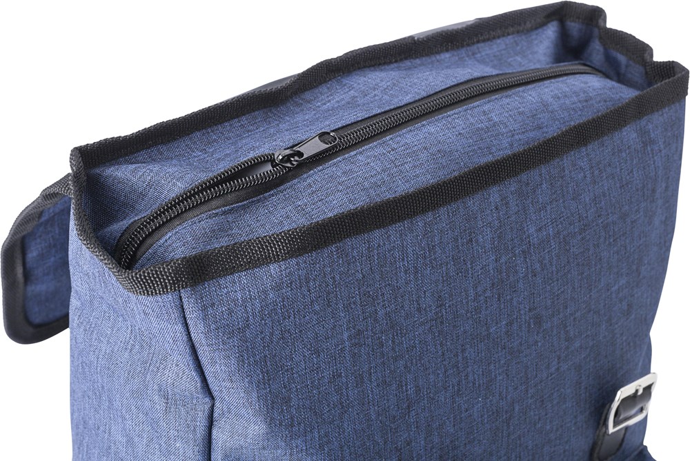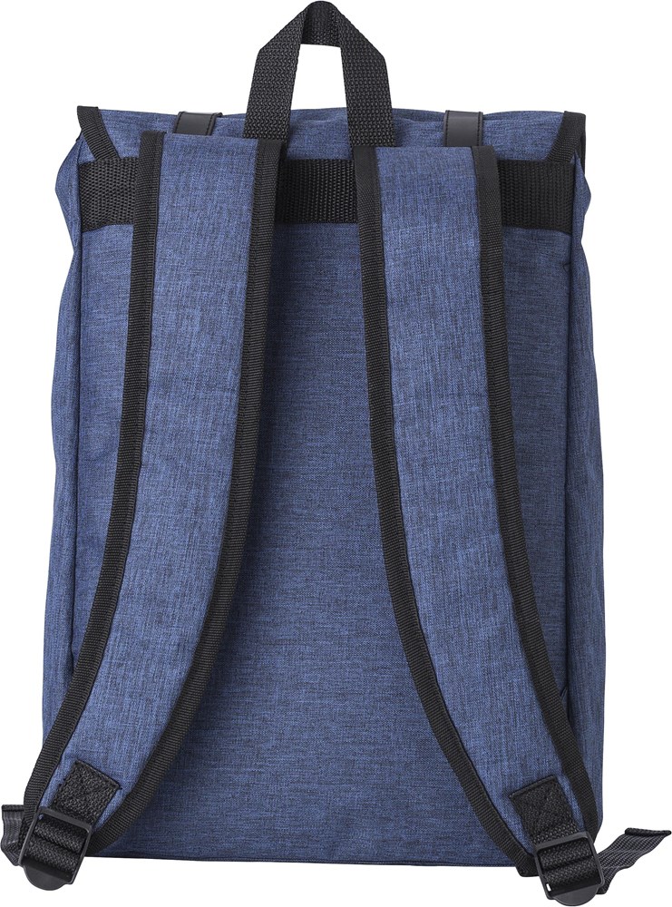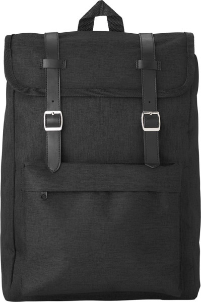 Polyester (300D + 210D) rugzak met voorvak. De flap sluit met twee metalen gespen. De rug en schouderbanden zijn gewatteerd en de schouderbanden zijn verstelbaar.