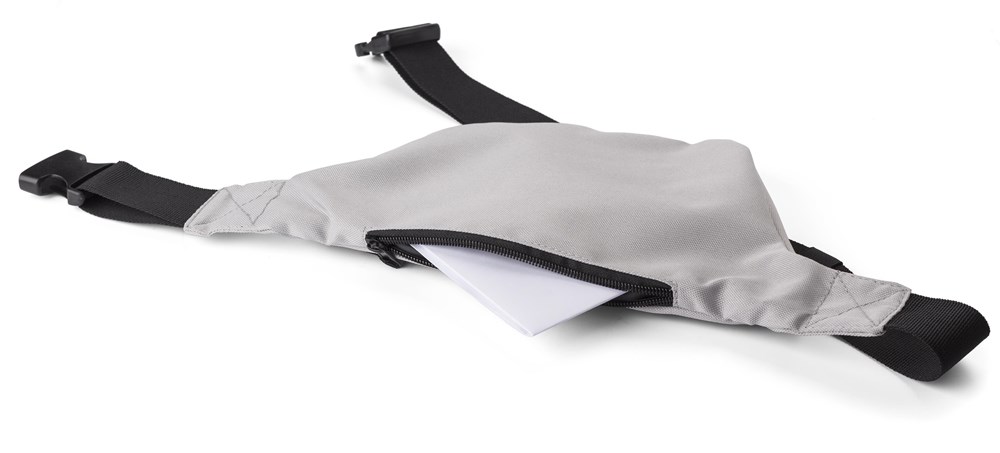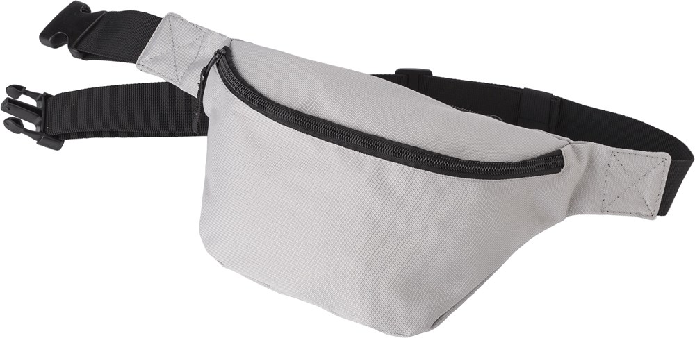 Heuptas van polyester (600D) met een voorvak en een klein vakje aan de achterkant. Beide vakken zijn afsluitbaar door middel van een ritssluiting. Met zwarte verstelbare riem met stevige gespsluiting.