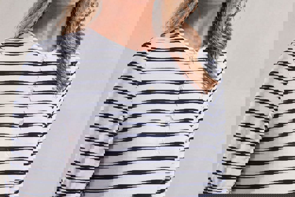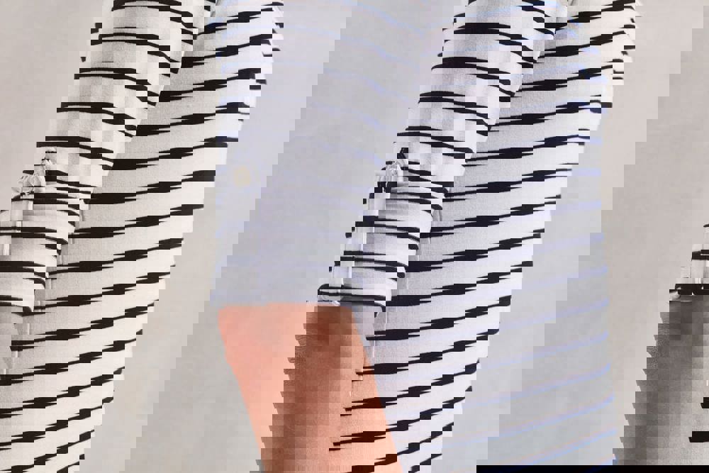 82% polyester / 14% viscose / 4% elasthan. Met kleurgeweven strepen White / Navy. Een eenvoudige maar polyvalente stijl die met zowel lange als opgestroopte mouwen kan worden gedragen. Dankzij de zachte en soepele stof is dit een meer casual en trendy alternatief voor het klassieke overhemd. Opstroopbare mouwen met een knooplijst vooraan de arm. Ronde halsopening met knooplijst met 3 knopen. Ribboord aan de halsopening en de mouwuiteinden. Zachte en soepele stof.