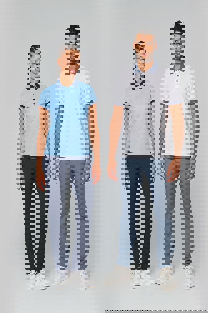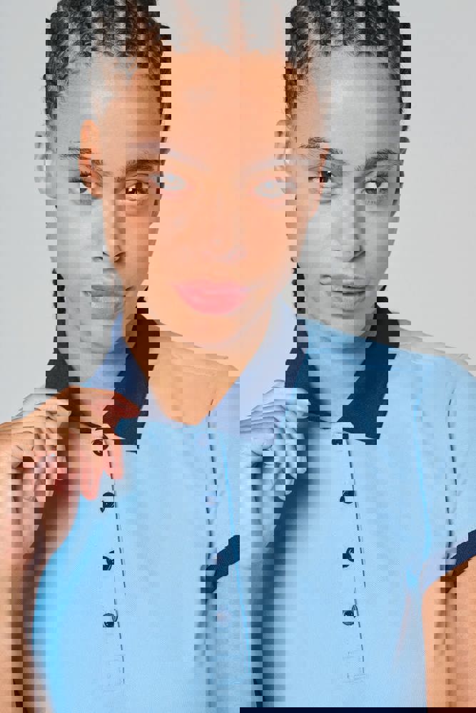 100% piquépolyester Cool Plus®. Getailleerde snit en moderne look. Kraag en mouwuiteinden in contrasterende ribboord. Knoopsluiting met 4 knopen (contrasterend of effen, afhankelijk van het model). Zijsplitten.