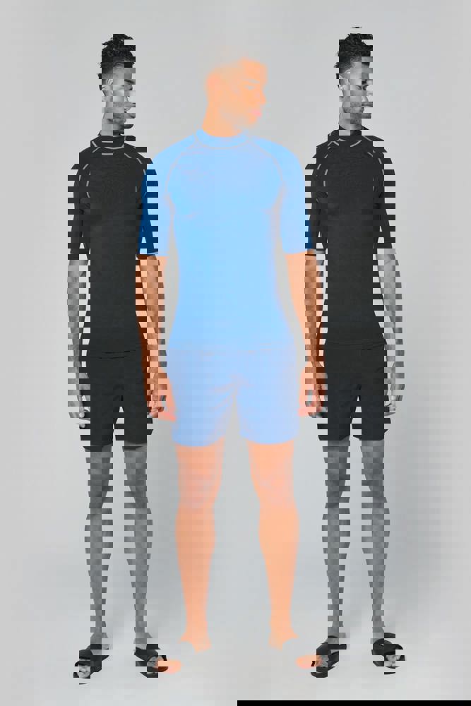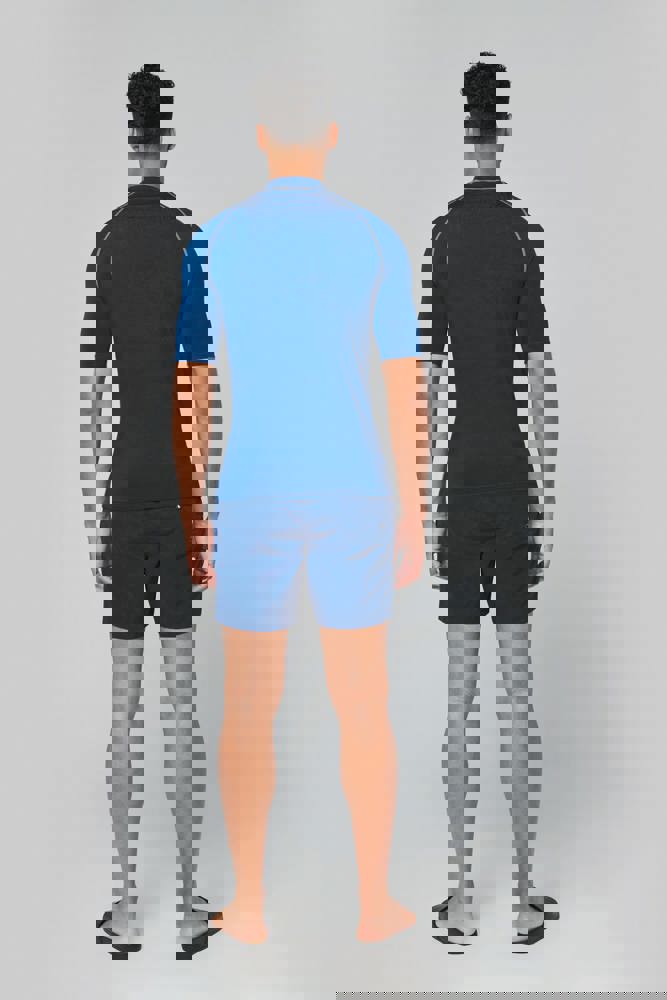 88% polyester / 12% elasthan. Stretchtricot. Bescherming UV 40+ in overeenstemming met de EN13758-1&2-norm. Korte mouwen. Opstaande kraag. Heel nauw aansluitende snit. Elastische gesp in de zoom vooraan om het koordje van de short door te steken en het T-shirt zo op zijn plaats te houden. Contrasterende stiksels. Mouwuiteinden en onderkant afgewerkt met dubbel stiksel.