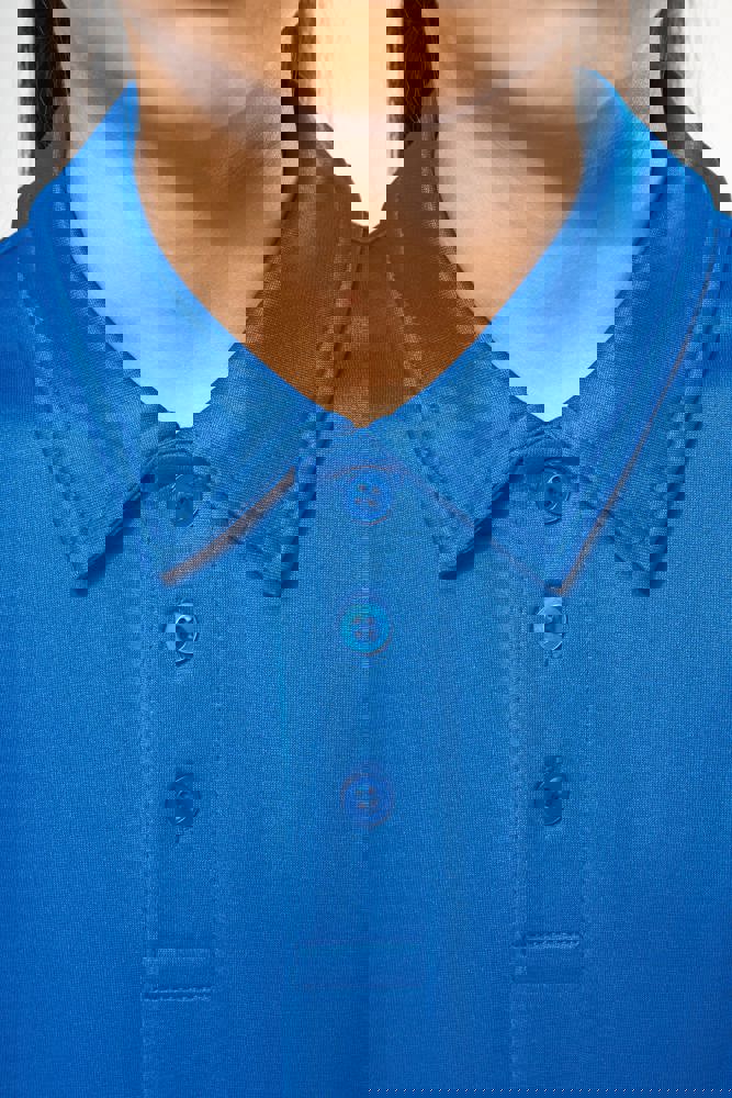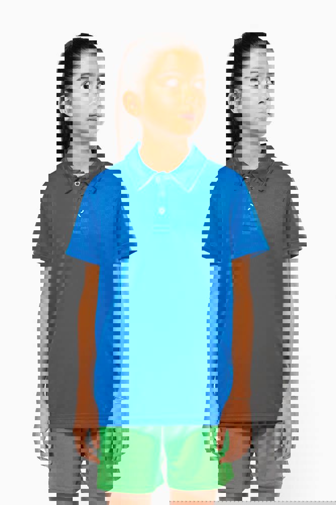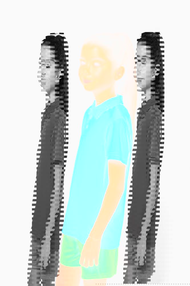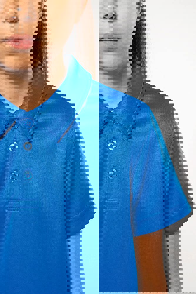 50% polyester CoolPlus® / 50% polyester. Ademende kinder polo. Knooplijst met 3 knopen. Afwerking met dubbele stiksels.