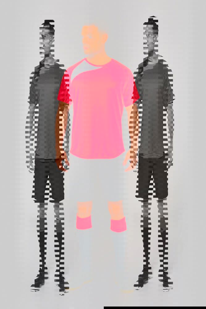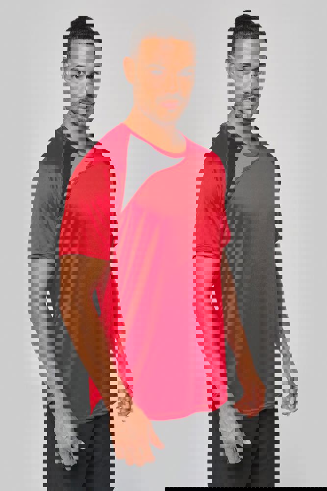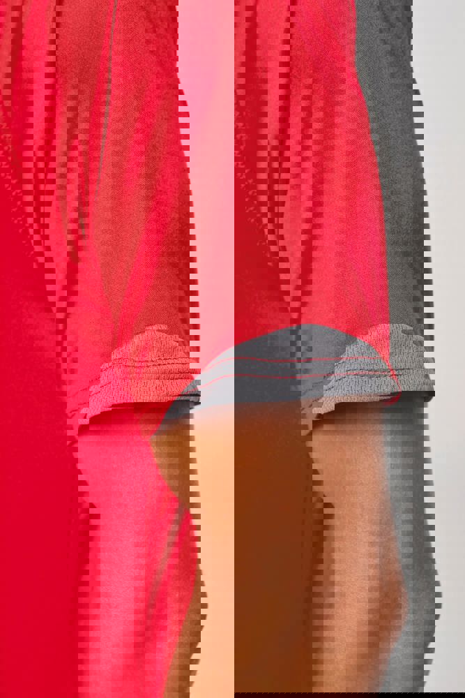 100% polyester. Inzetstukken in contrastkleur op de borst en mouwuiteinde. Overstiksels toon op toon. Afwerking met dubbele stiksels onderaan en aan de mouwuiteinden.