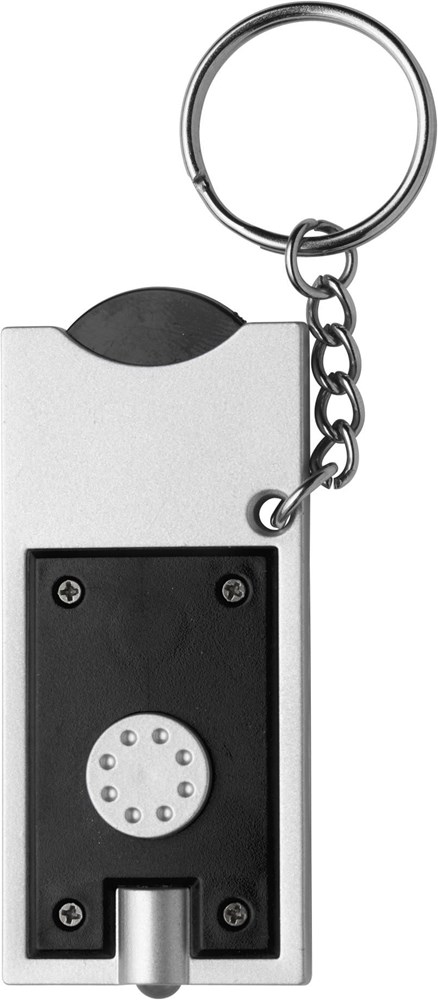 Kunststof sleutelhanger met LED lampje en kunststof winkelwagenmunt, incl. batterij.