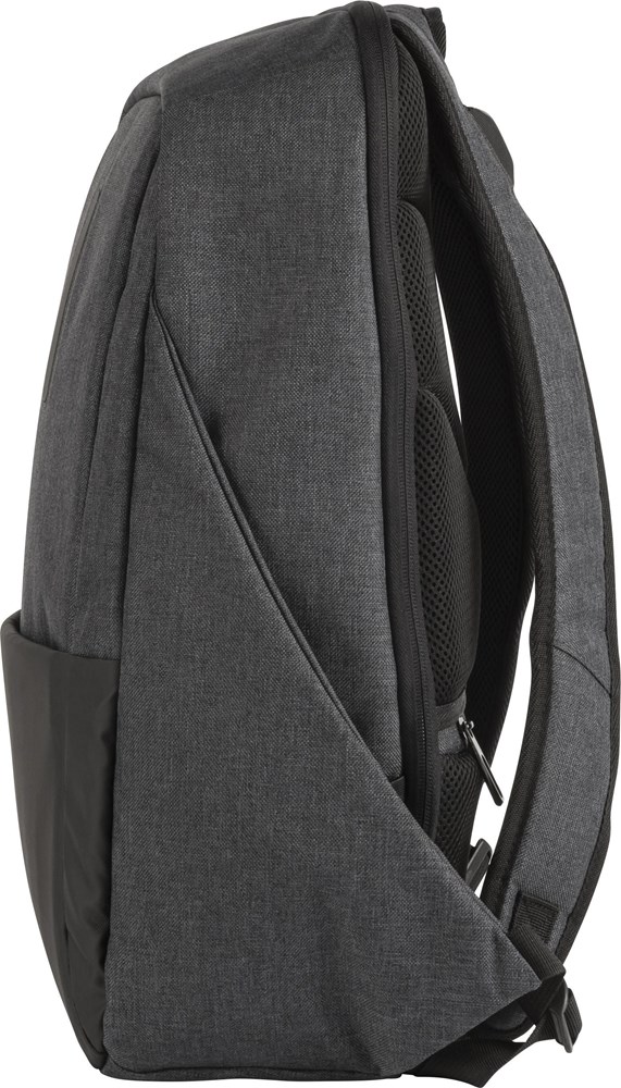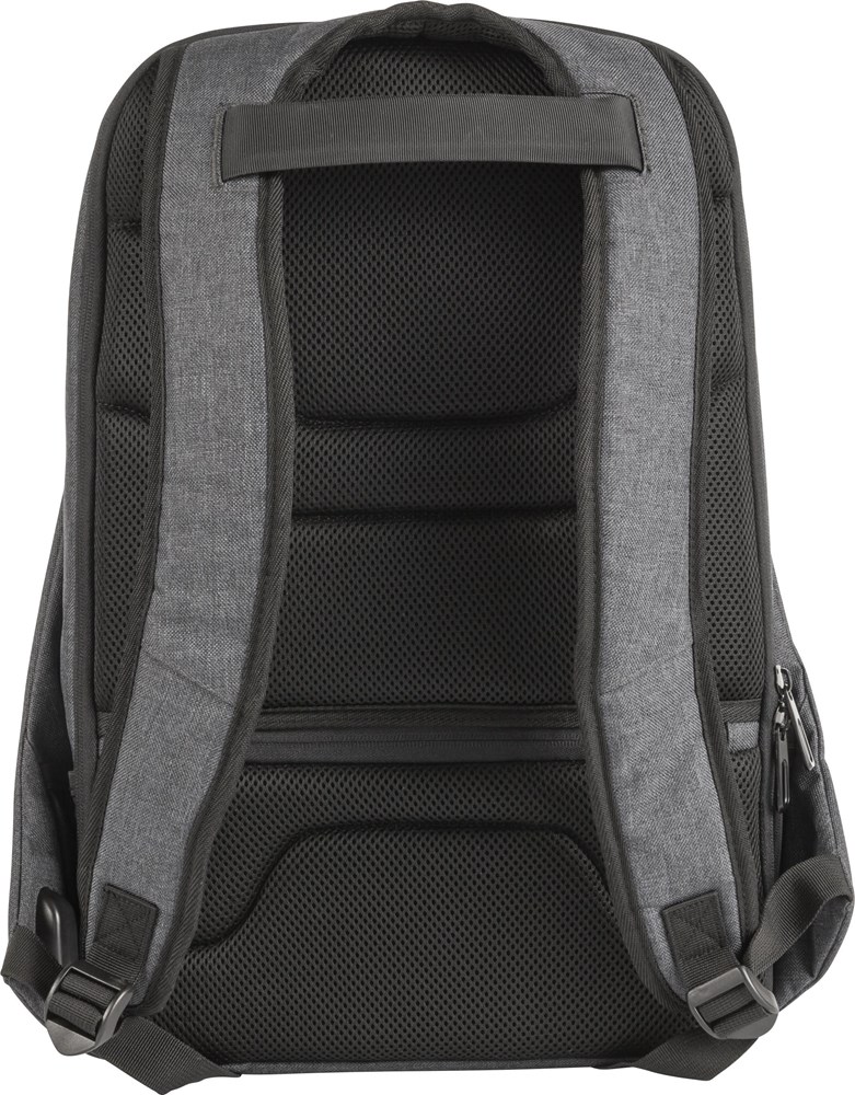 PVC laptop rugtas. Het grote vak is gevoerd om de laptop (tot 15 inch) te beschermen en heeft tevens extra vakken aan de binnenzijde. Het voorvak heeft een ritssluiting. De tas heeft verstelbare schouderbanden en een handvat.
