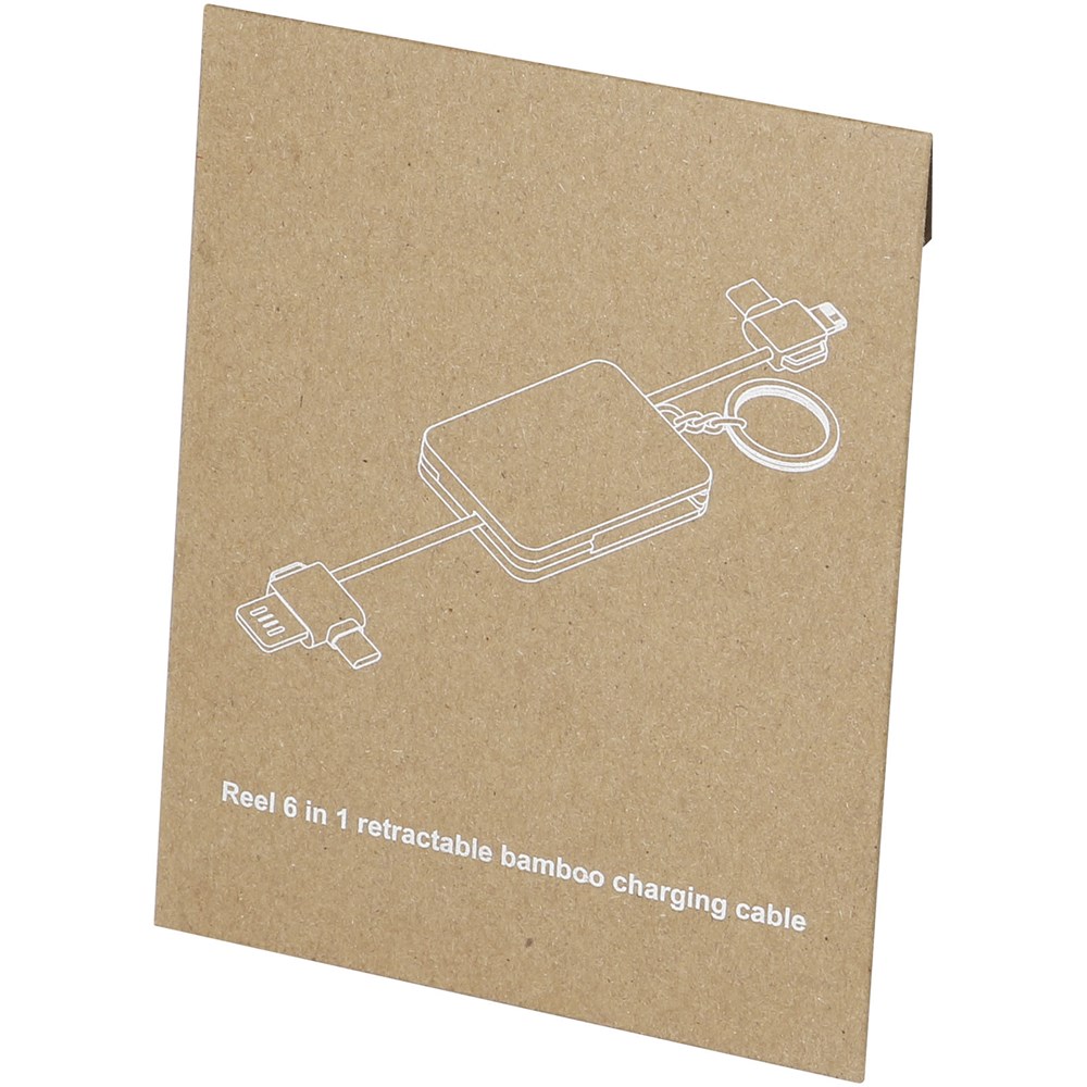 De Reel 6-in-1 bamboe oplaadkabel met sleutelhanger laat zien waar duurzaamheid en stijl samenkomen. Met een lengte van 12 cm levert deze compacte en intrekbare TPE-kabel 2A laadvermogen zonder rommel. Ingang: USB A en Type-C. Uitgang: Type-C, micro-USB, 2-in-1 micro-USB en lightning dual tips die compatibel zijn met zowel iOS- als Android-apparaten. De aluminium USB-uitgangen zorgen voor een veilige en stabiele verbinding, waardoor je altijd betrouwbaar kunt opladen. De zilveren roestvrijstalen sleutelhanger dient als een handige manier om de kabel te organiseren en te dragen. Geleverd in een envelop van kraftpapier.